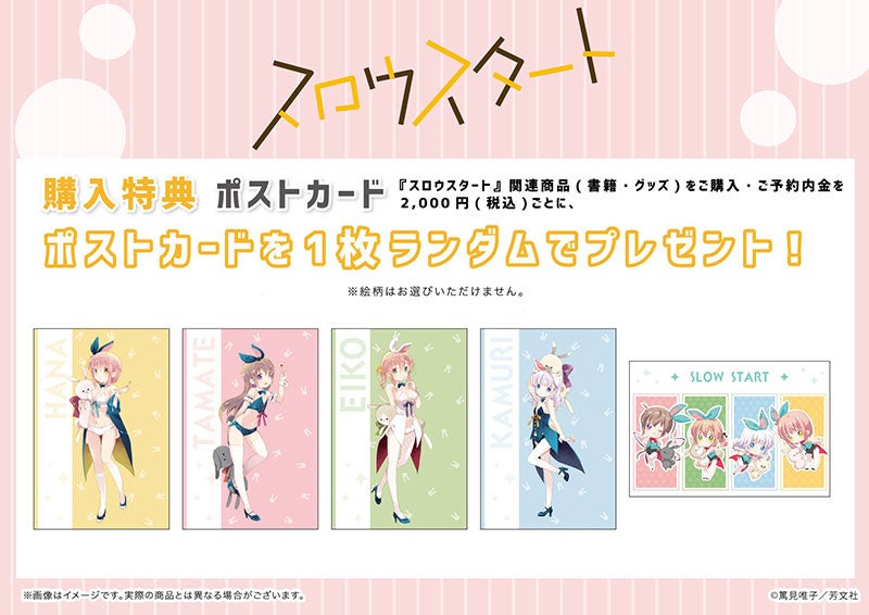 期間中に会場内にて『スロウスタート』関連商品(書籍・グッズ)をご購入・ご予約内金2,000円(税込)ごとに、ポストカード(全5種)を1枚ランダムでプレゼント!