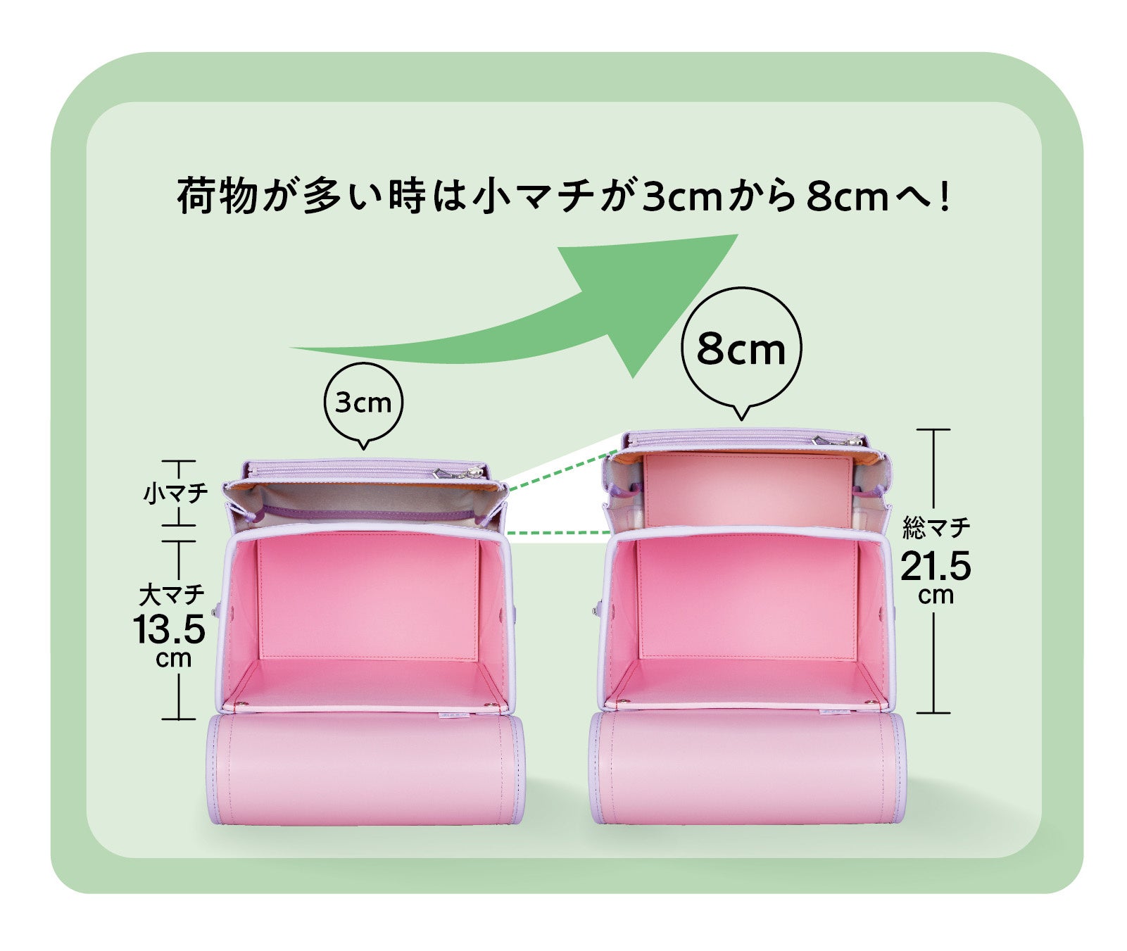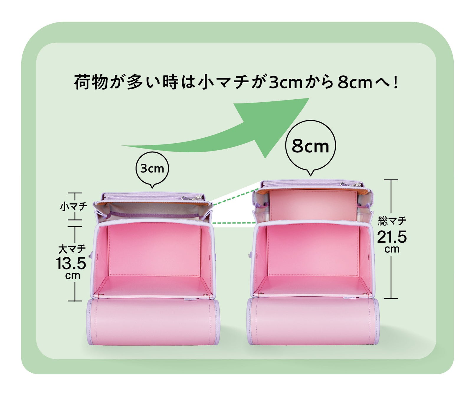 かるすぽ最大の総マチ21.5cmの大容量設計です。荷物の量に応じて、小マチを3cmから8cmへ広げることができます。しっかり収納でき、手荷物なしの安全で安心な通学をサポートします。