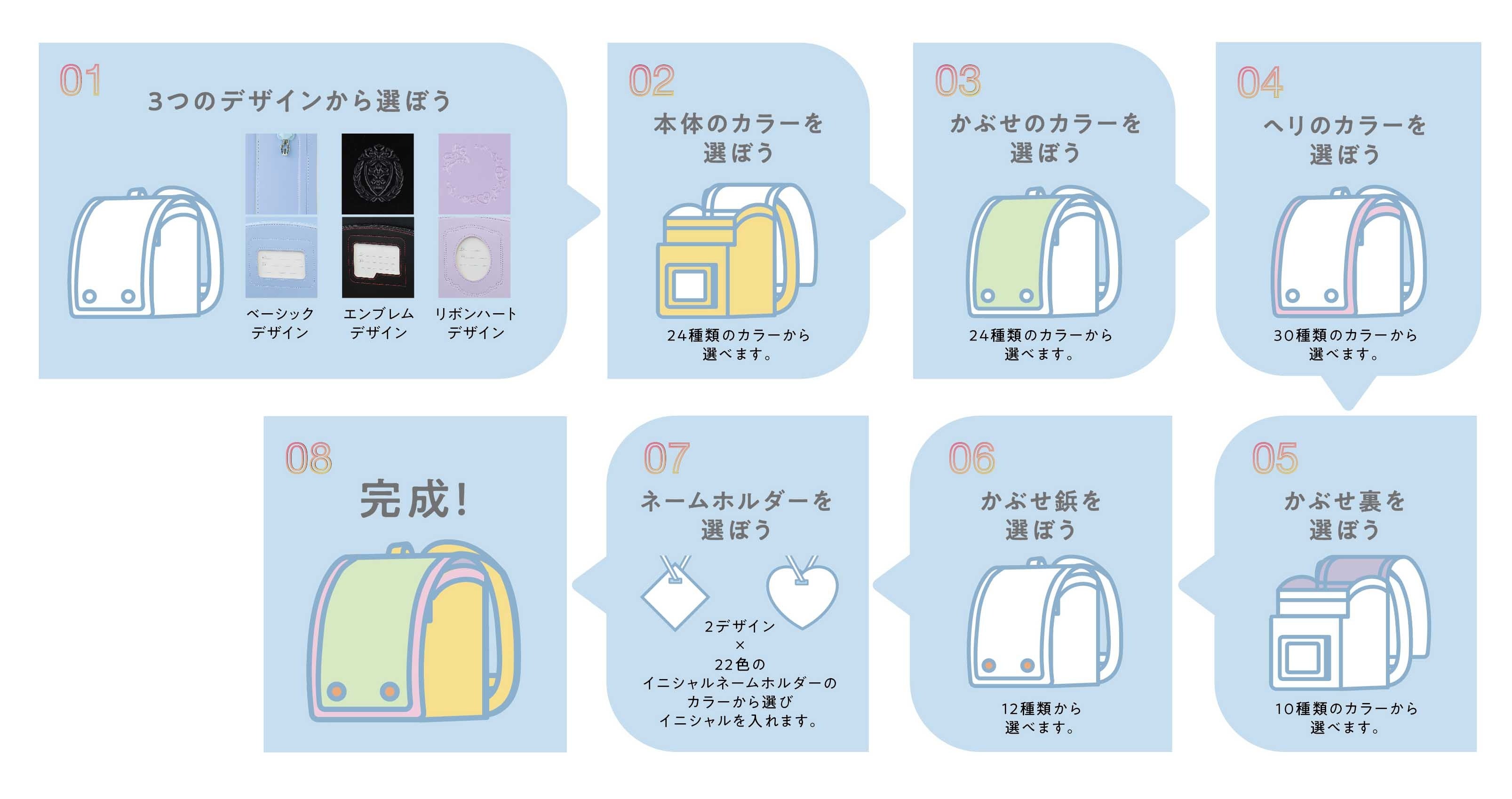 「はなまるランドセル24」がベースの「MYカラー」はパーツやデザインを組み合わせ自由で自分好みに選べます。組み合わせは前年比1.3倍の約622万通りあります。