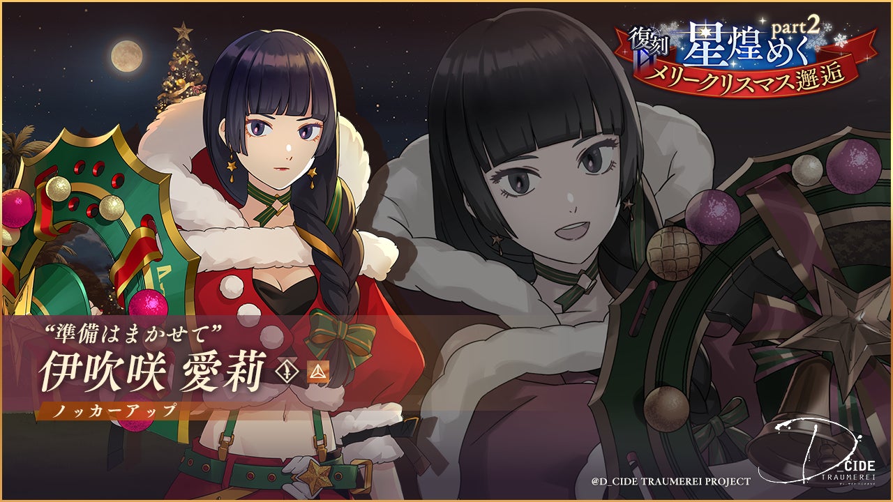 株式会社ブシロード(本社:東京都中野区、代表取締役社長:橋本義賢)は、株式会社サムザップ(本社:東京都渋谷区、代表取締役:日高裕介)、株式会社ドリコム(本社:東京都品川区、代表取締役社長:内藤裕紀)と共同で企画するゲームアプリ「D_CIDE TRAUMEREI/ディーサイドトロイメライ」にて、イベント「呪画の悪夢 ~絵に取り憑かれた男~」と、「復刻 星煌めくメリークリスマス邂逅part2」を開催いたします。報道関係の皆様におかれましては、ぜひ本情報をお取り扱いいただけますよう、お願い申し上げます。