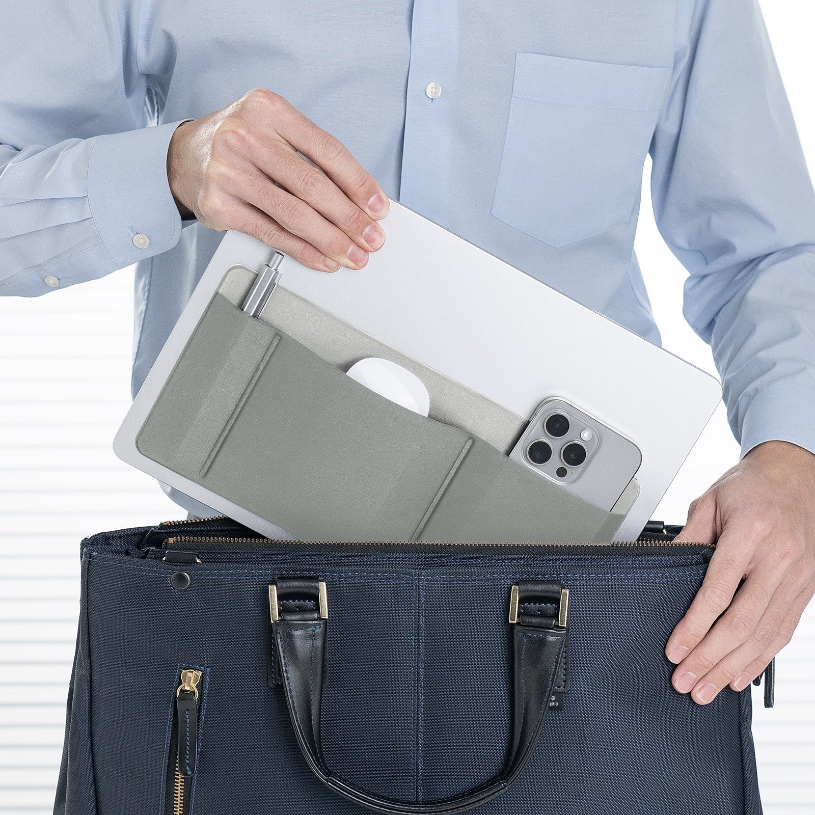 ポーチには用途に合わせて使える3つのポケットを搭載。伸縮性のある素材が採用されており、厚みのあるモバイルバッテリーやマウスなどもしっかりフィットします。小物が散らばりやすい方や、ガジェットが多い人にとって、自然と整理整頓ができる“頼れる相棒”になります。