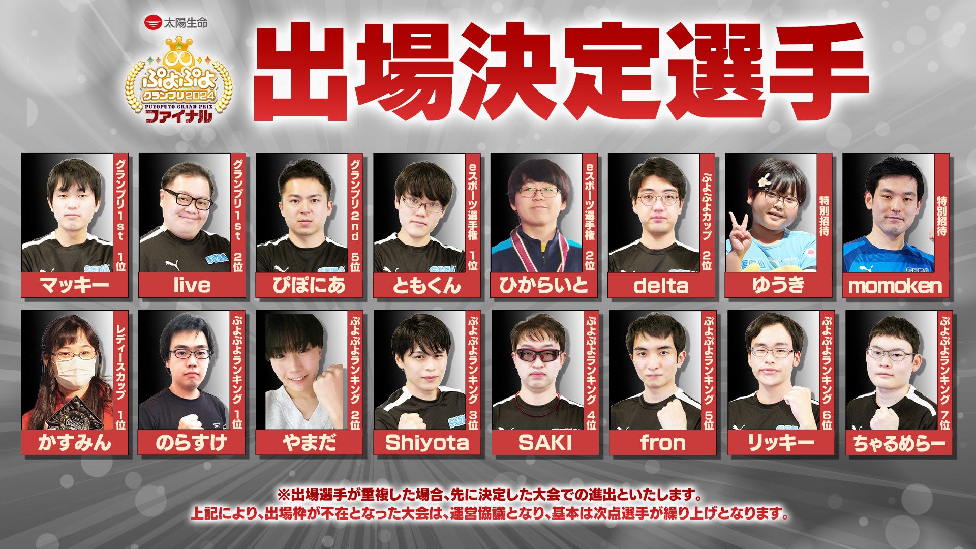 ※セガ公式プロ大会「ぷよぷよグランプリ 2024 2nd」にて出場権を獲得したTom選手は、ご都合により辞退となったため、こちらの出場枠については、ぷよぷよランキングより選出を行っております。