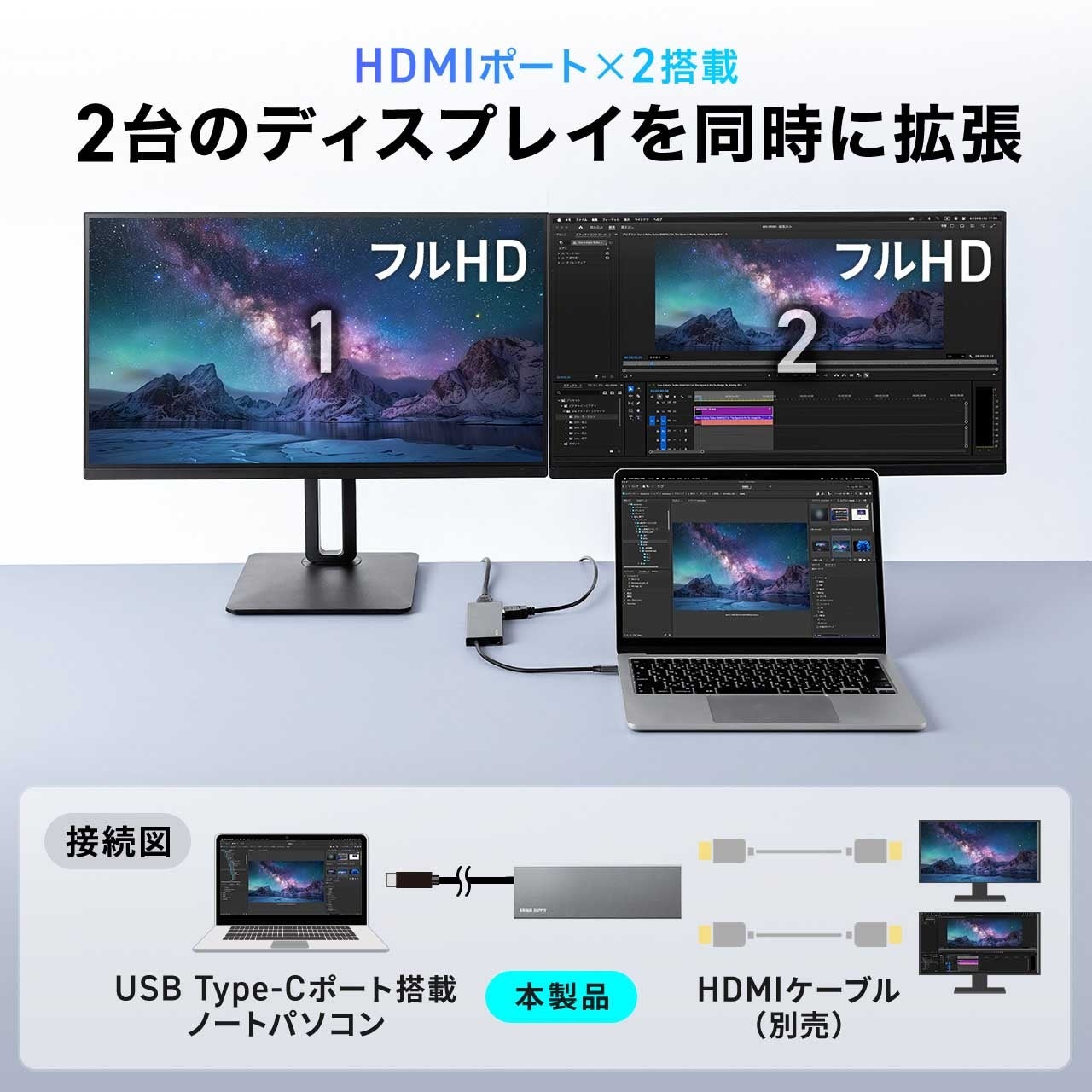 ●HDMIポートから2画面の映像出力に対応し、フルHDでの2画面出力が可能です。(400-DKMP6GMは4K)