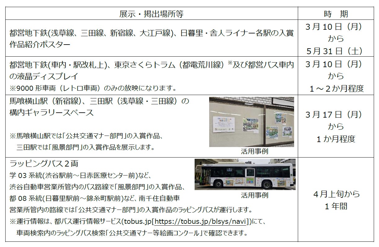 入賞作品は、3月10日(月)から順次、都営地下鉄(浅草線、三田線、新宿線、大江戸線)、日暮里・舎人ライナー各駅等で入賞作品を紹介するポスターを掲出します。加えて、馬喰横山駅及び三田駅で入賞作品の展示を行うとともに、都営地下鉄、都営バス等の車内ディスプレイでの放映やラッピングバスの運行を行います。また、都営交通最優秀賞ほか入賞した一部の作品を3月下旬に発行する「都営交通マナーブック」(都内小学4年生向けに学校・駅等で約13万部配布)に掲載します。この他、作品は公共交通利用時のマナー啓発等に活用いたします。