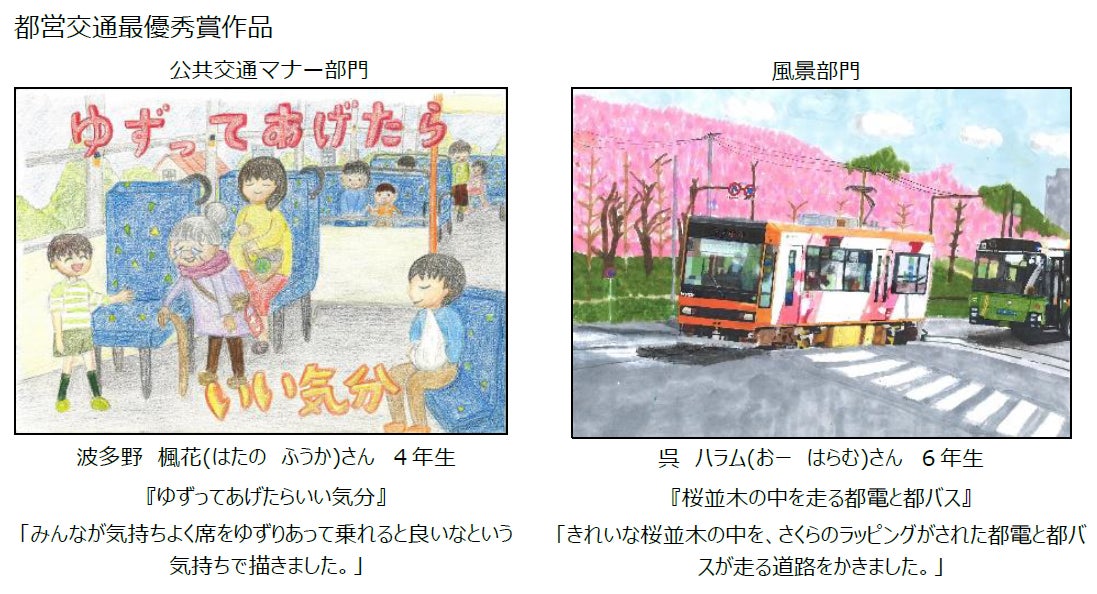 東京都交通局では、都内在住又は在学の小学生を対象に、誰もが楽しく、気持ちよく公共交通を利用するためのマナーについて考える機会とするとともに、公共交通について愛着や親しみを感じてもらうことを目的として、令和6年12月2日から令和7年1月10日の間、絵画コンクールを開催し411作品の力作をお寄せいただきました。選考の結果、以下のとおり入賞作品を決定しましたのでお知らせします。