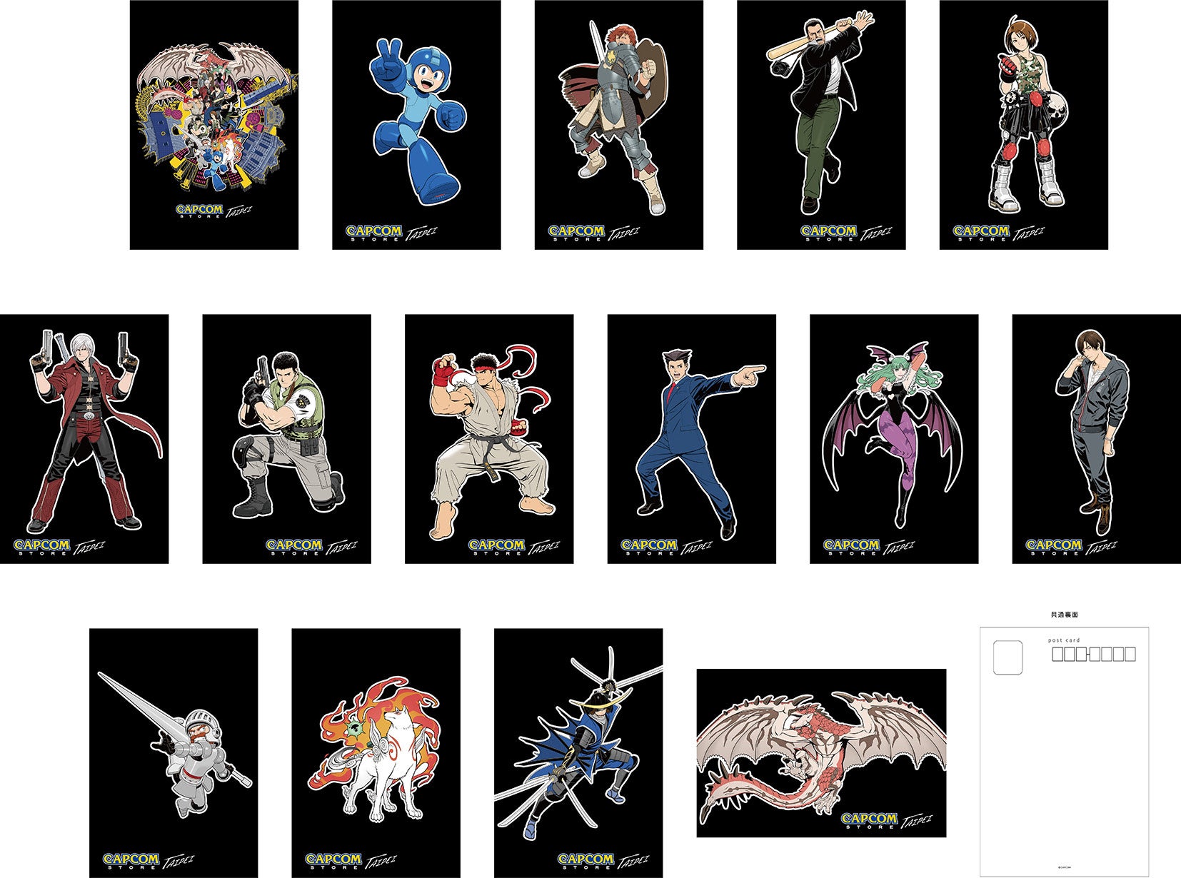 メインビジュアルに登場するカプコンキャラクターをデザインしたポストカード(全15種)を、ランダムで1枚プレゼントいたします。