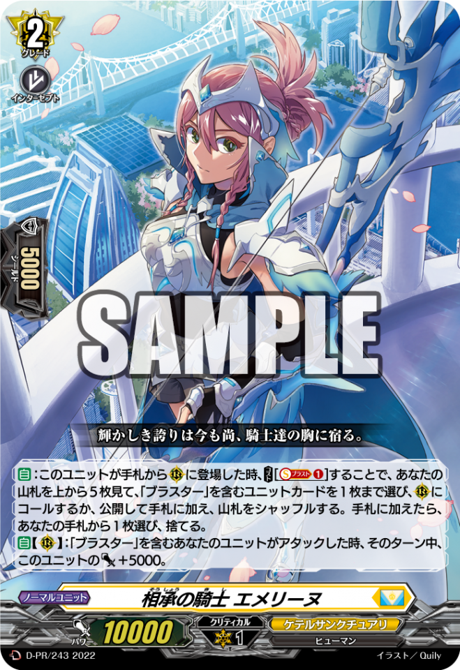 付録には、好評発売中のブースターパック『群雄凱旋』にも収録されている「ブラスター」を強力サポートするカード「相承の騎士 エメリーヌ」も封入されています。