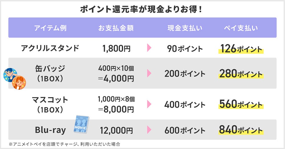 9月2日より「アニメイトペイ」をアニメイト店頭でチャージいただいた際のアニメイトポイント還元率が2%から4%にUPいたします。「アニメイトペイ」でのお支払時の3%のポイント還元と合わせると、合計で購入金額の7%のポイント還元を受けることができ、アニメイトで利用可能なお支払い方法の中で最大のポイント還元率となります。