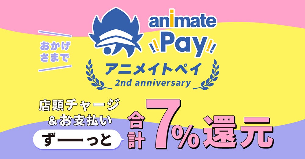 株式会社アニメイトは、チャージ式電子マネー「アニメイトペイ」の店頭チャージ&お支払いのアニメイトポイント還元率を、2024年9月2日から合計7%にUPいたします。