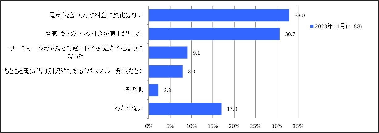 一方、データセンター利用企業にデータセンターの利用料や電気料金について聞いたところ、30.7%が値上がり、9.1%がサーチャージ形式の導入で電気代が別途かかるようになったとしており、合計で39.8%(「わからない」を除いたうちの約半数)が値上がりしたと回答しています。またパススルー形式の場合はもとから変動しており、市場にあわせて電気料金は値上がりしていると想定されます。
