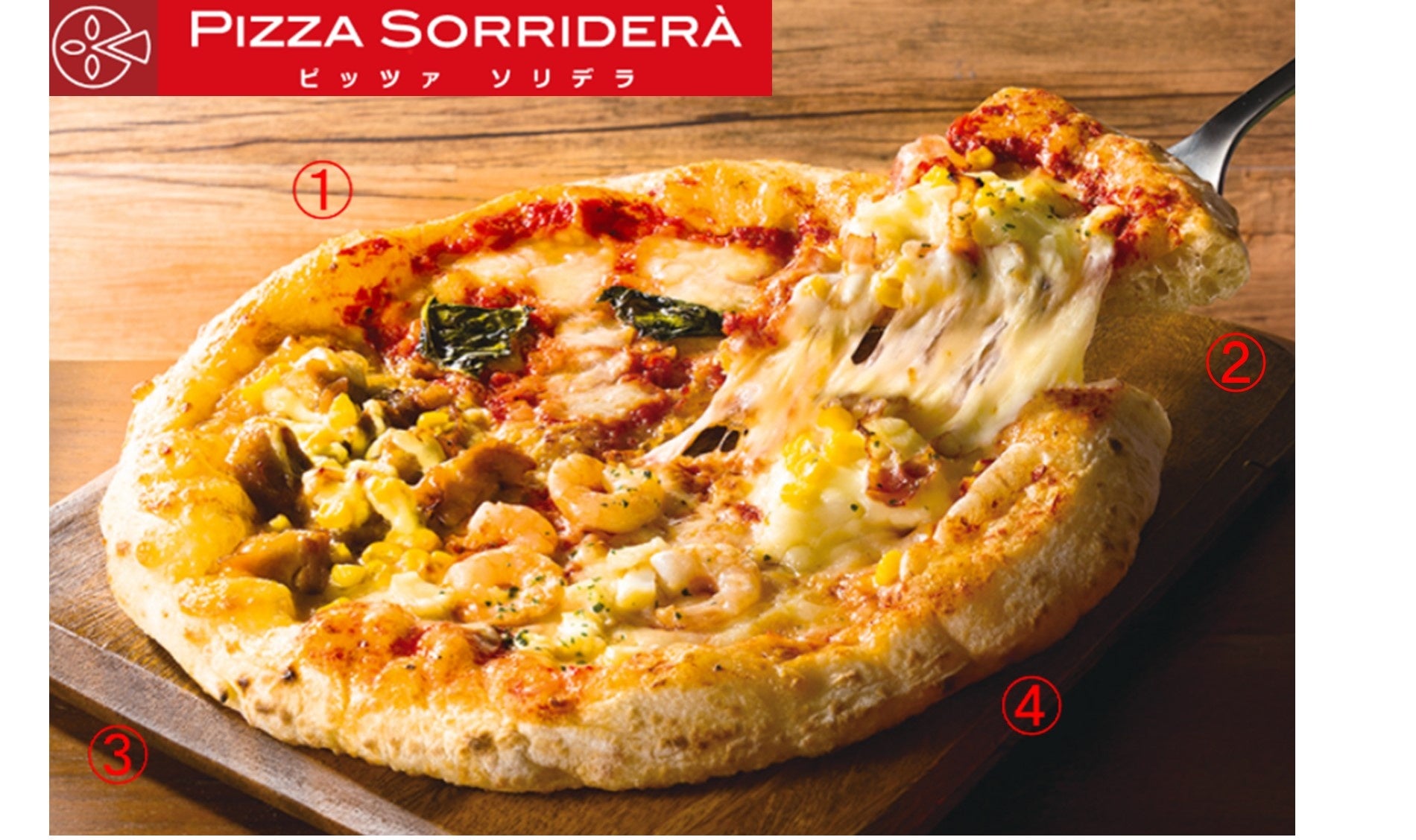 「ピッツァソリデラ・クワトロ・グラツィエ」は、①チーズトマトのうまみと爽やかなバジルの風味マルゲリータ、②コクとうまみのポテトとベーコン、③甘辛タレが絡むてりやきチキン、そして④魚介の旨みが広がるシーフードの4つの人気のピッツアを一度に楽しめる贅沢な一枚です。選ぶ楽しさとシェアする喜びをひとつにした、心もお腹も満たす充実感たっぷりなピッツアです。