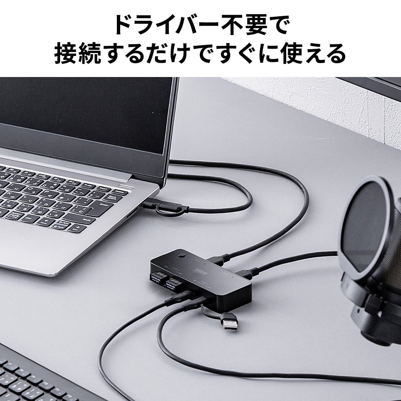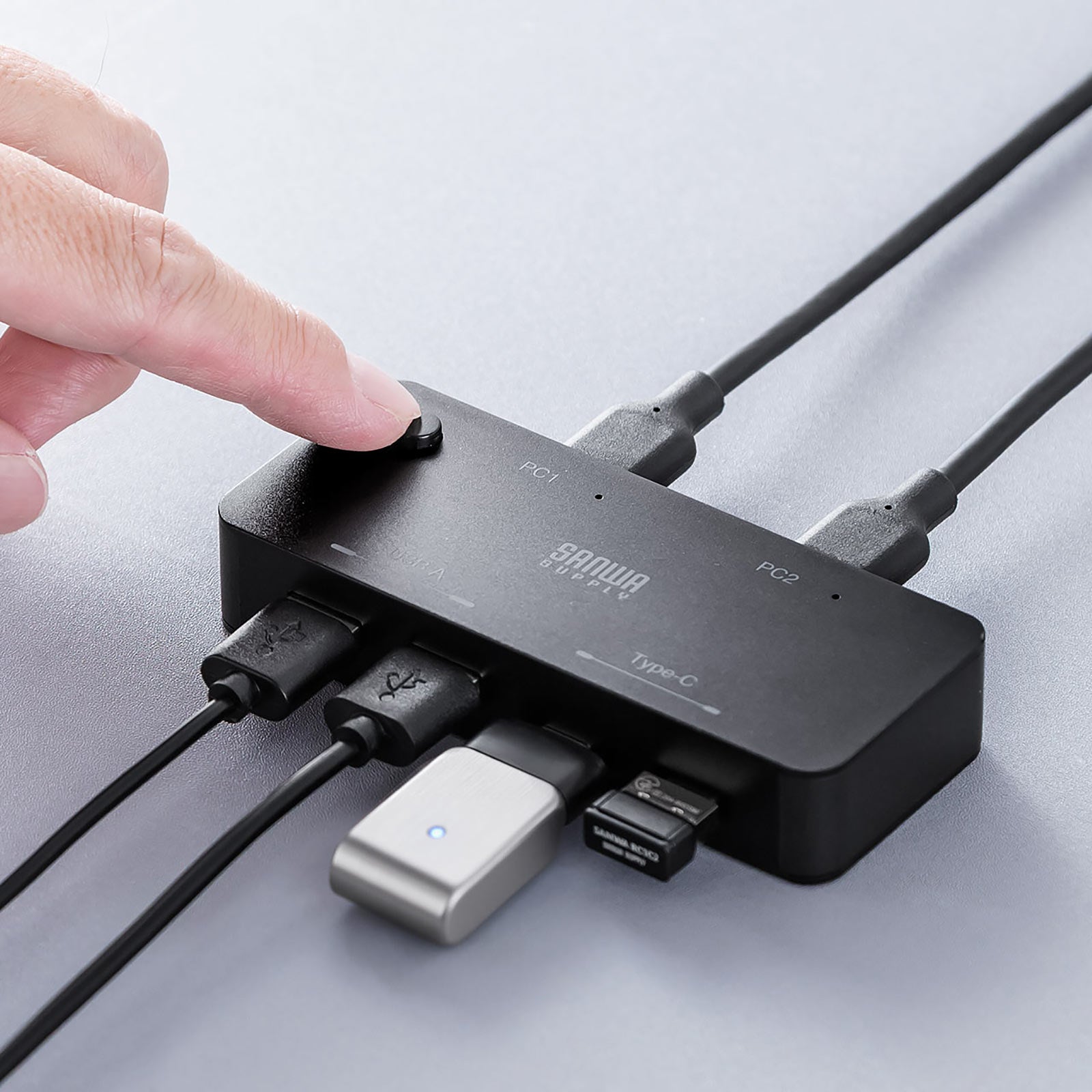 USB A/Type-C両対応ケーブル付き、5Gbps高速転送でマウス・キーボード・メモリなどをワンタッチで快適切替できるUSB切替器。