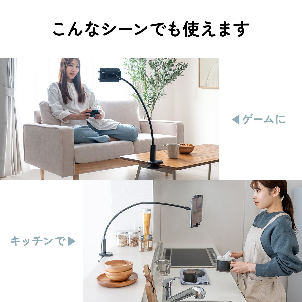 本製品は、縦向き、横向きどちらでも取付可能なタブレット・スマートフォン用アームスタンドです。4.7~13インチまでに対応し、挟み込むことで固定できます。