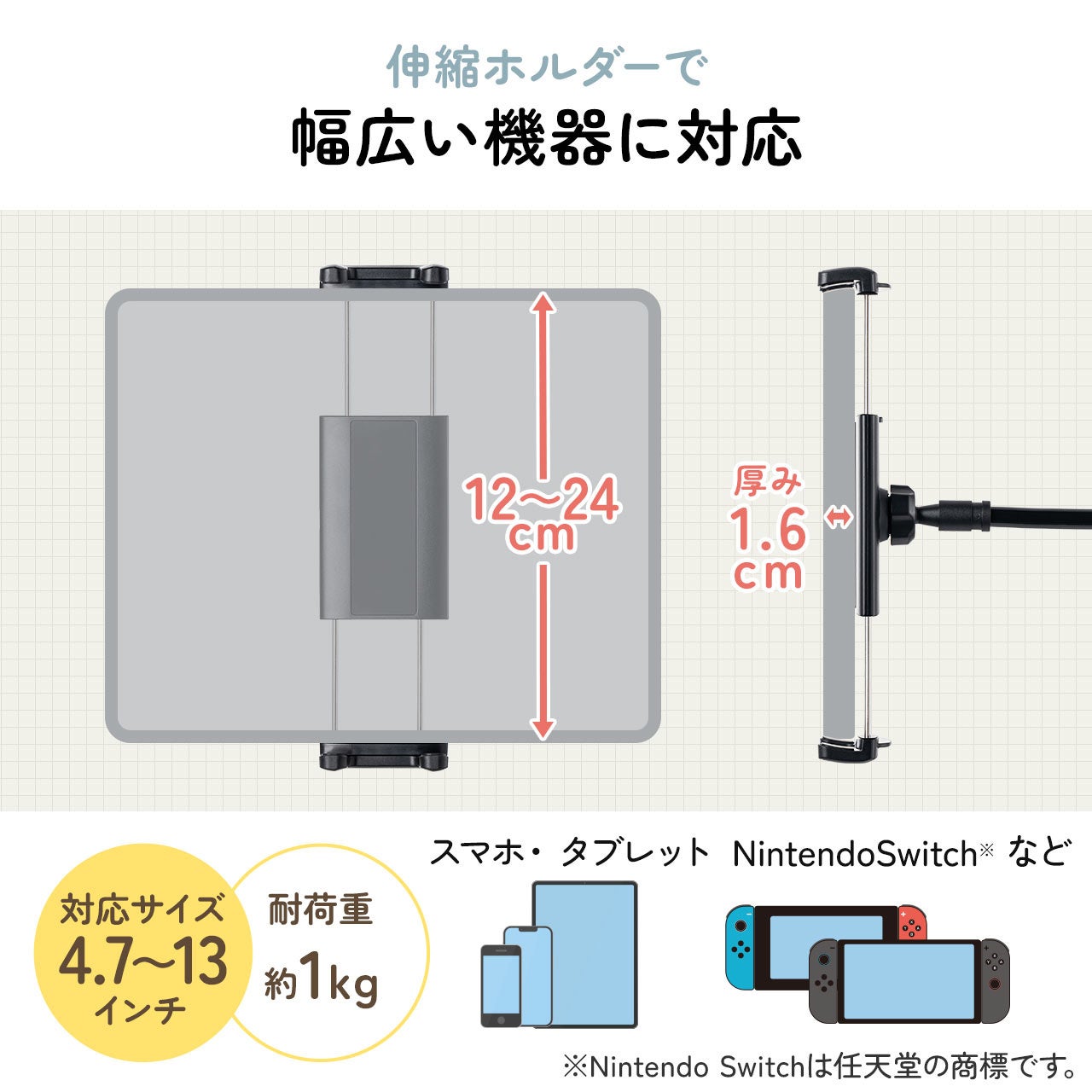 伸縮ホルダーは幅広い機器に対応でき、12~24cm、厚み1.6cm、耐荷重1kgまで対応します。機器のコネクタを塞がないので、充電しながら使えます。