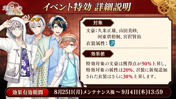 さらに、イベントと同時に開催される限定召装『真夏ノ太陽ノ下デ』にて新規追加された「久米正雄」「山田美妙」「河東碧梧桐」の〈夏私服〉を編成すると、得点の獲得率がそれぞれ30%上昇します。