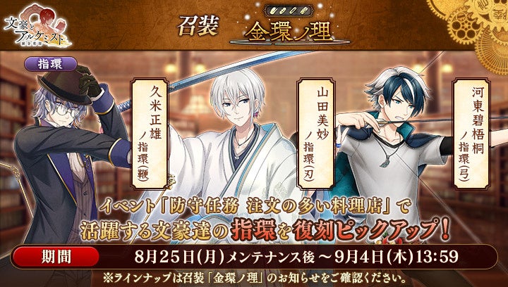 召装『金環ノ理』のラインナップを更新いたしました。この召装では、イベント『防守任務「注文の多い料理店」』で活躍する「久米正雄」「山田美妙」「河東碧梧桐」の指環を一定の確率で入手できます。
