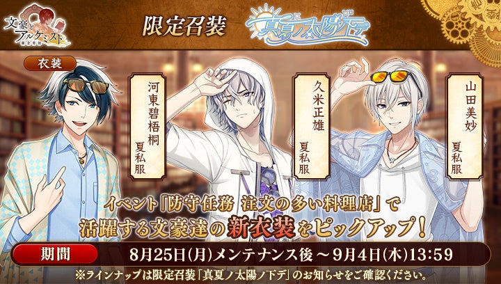文豪の「衣装」や、会派に装備する事で能力を強化できる「装像」などが入手できるコンテンツ「召装」に、限定召装『真夏ノ太陽ノ下デ』が期間限定で登場します。この召装では、イベント『防守任務「注文の多い料理店」』で活躍する「久米正雄」「山田美妙」「河東碧梧桐」の新衣装を一定の確率で入手できます。
