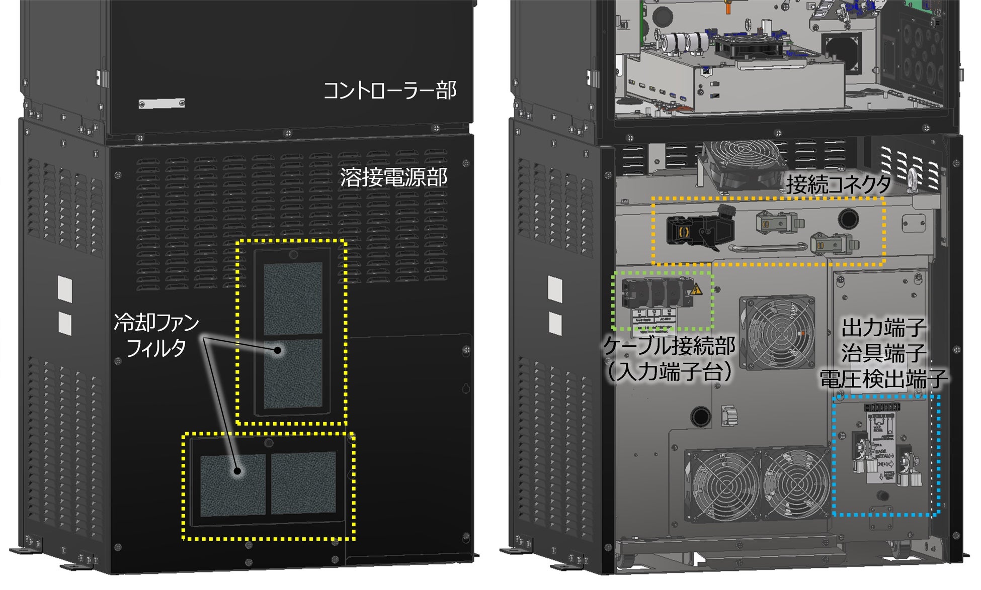 溶接電源部とコントローラー部を接続するコネクタやケーブル、出力端子、治具端子、電圧検出端子をすべて溶接電源の前面に配置しました。これらは前面パネルを取り外すだけでアクセス可能であるため、溶接電源部の付け外しが必要なメンテナンス時の作業性が向上しました。また、冷却ファンのフィルタも同様に前面に配置しました。これにより、メンテナンスに要する時間や溶接電源の清掃に要する時間を低減することで、稼働率・生産性の向上に貢献します。