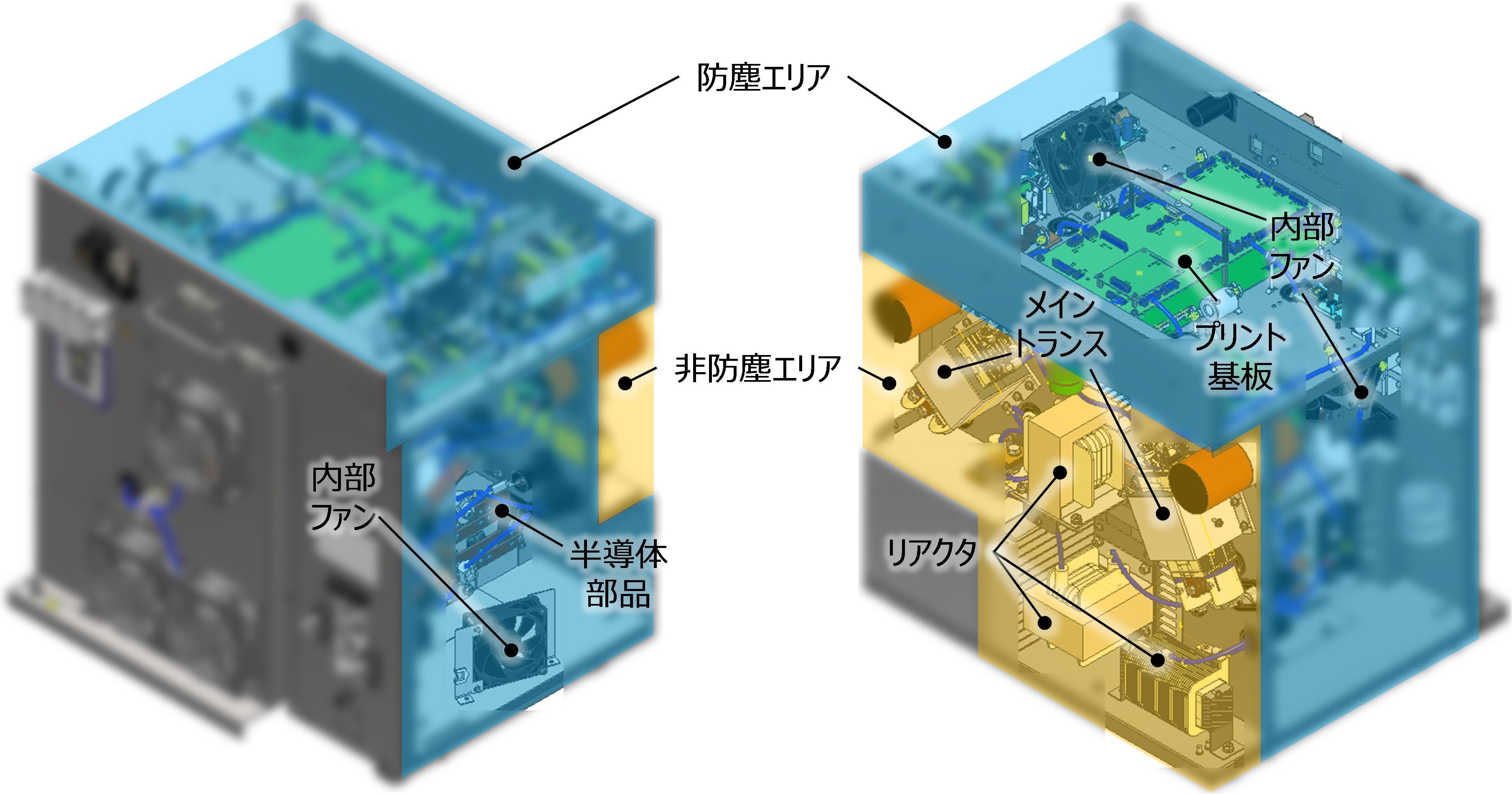 溶接中の発熱が大きいメイントランスやリアクタ類を、強制空冷するために非防塵エリアに配置し、粉塵の堆積によって破損することが懸念されるプリント基板や半導体部品を防塵エリアに配置しました。さらに内部ファンを配置することで、防塵エリア内でも発熱の大きい半導体部品などの温度上昇を抑制しました。これにより、各部品を効率よく冷却するとともに、粉塵の堆積を抑えることができ、高い冷却性と堅牢性を両立することができました。溶接現場のような厳しい環境下でも溶接電源が連続稼働できるため、工程のラインストップの低減に貢献します。