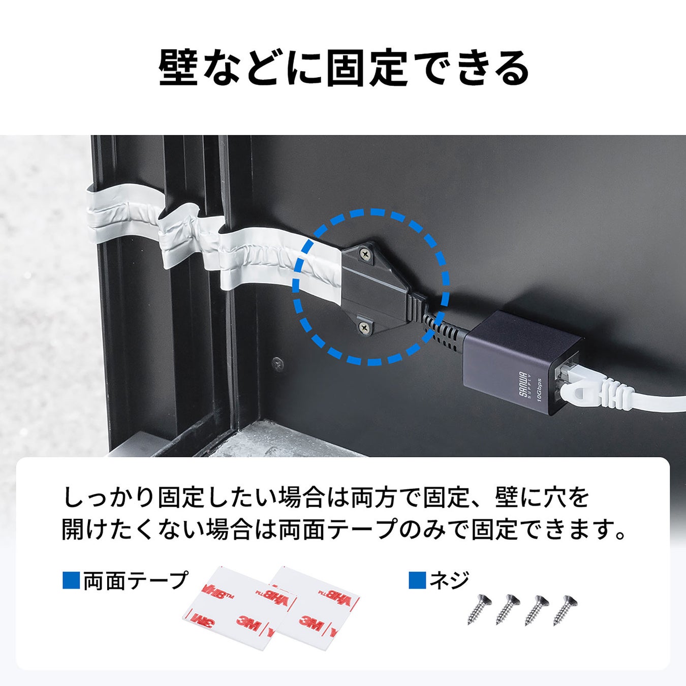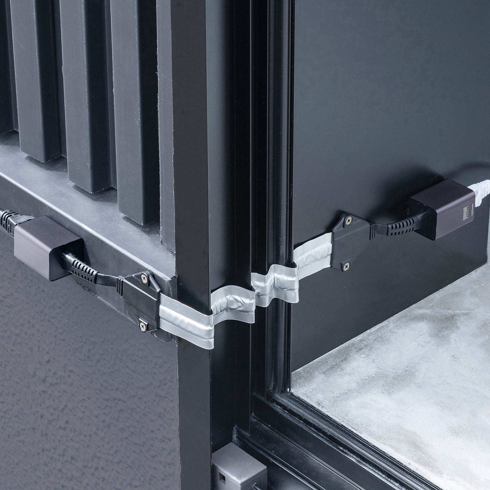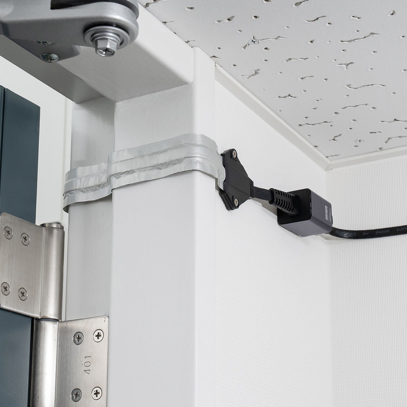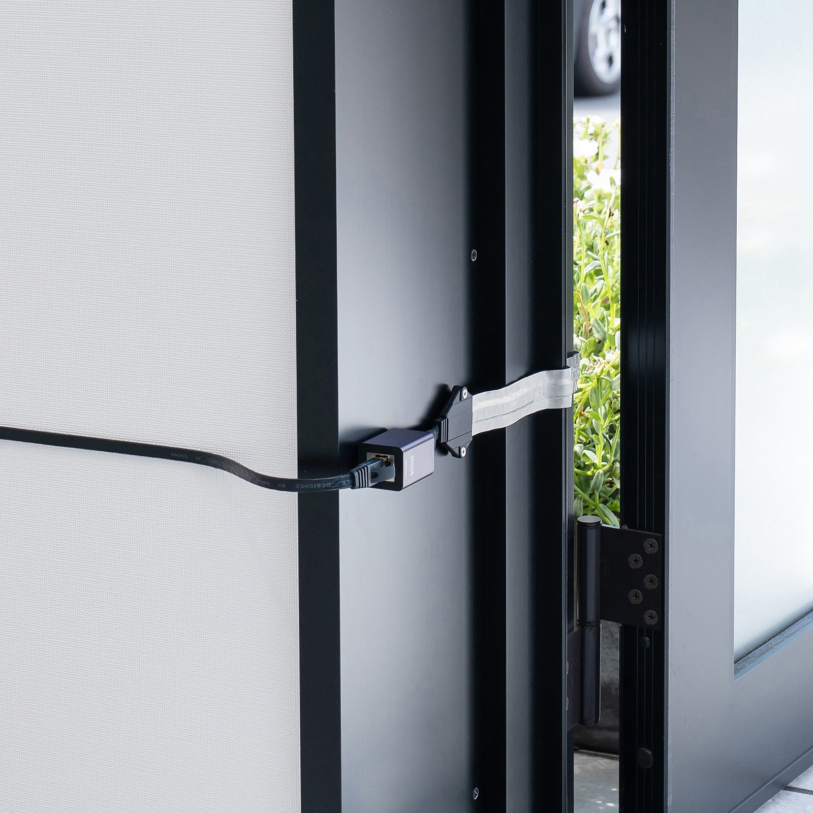 ケーブル両端のコネクタ部は、付属の両面テープまたは木ネジで簡単に固定できます。窓枠にもサッシにも対応し、工具を使わない手軽な設置から、よりしっかり固定する設置まで選択可能。