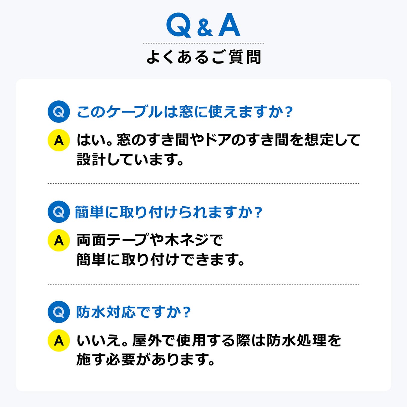 厚さ約1.8〜1.9mmのフラット構造により、窓やドアを閉めても違和感のない薄さを実現。従来のケーブルのように隙間が閉じにくい心配もありません。アルミテープで強化されているため、薄型ながら耐久性も確保。