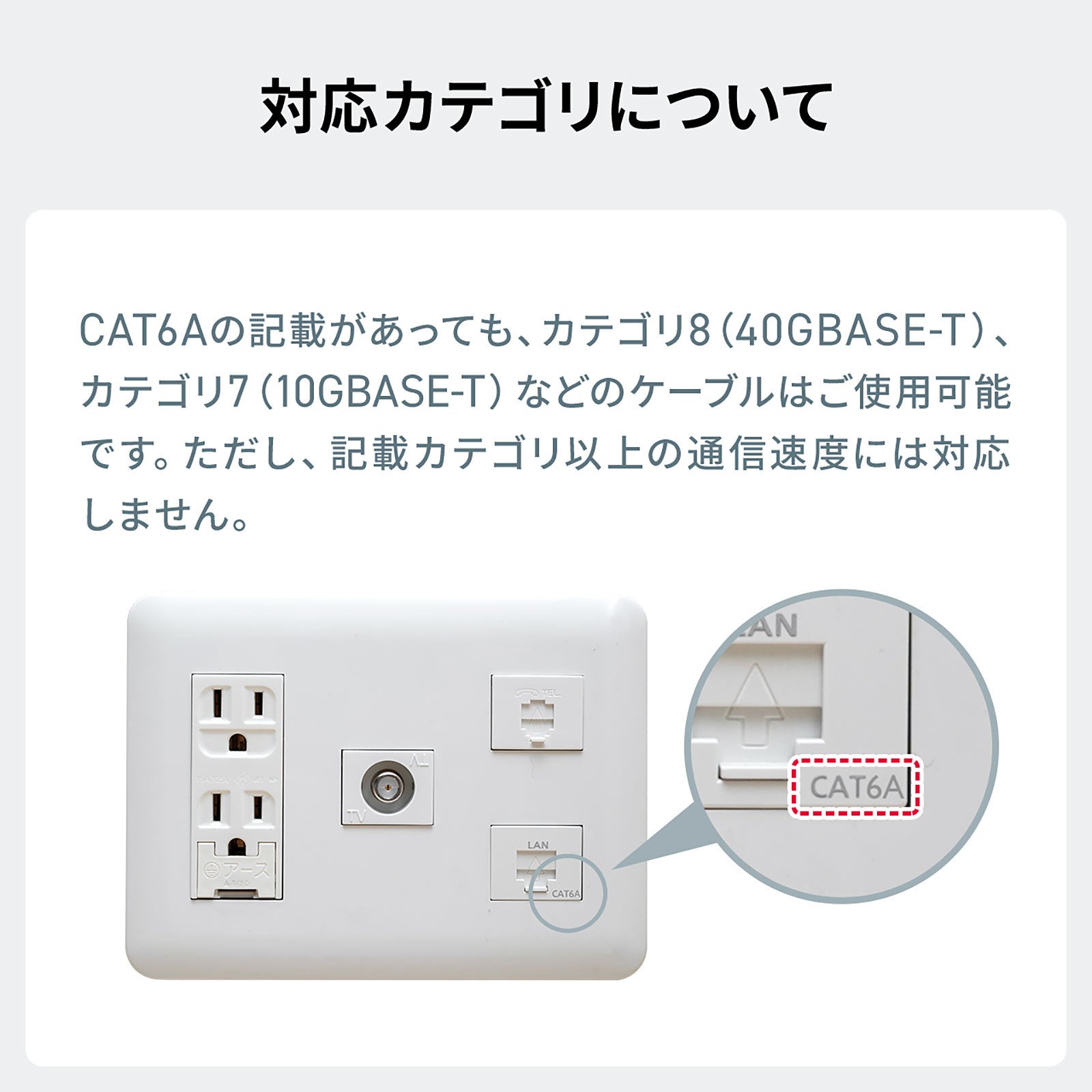 カテゴリ6A(CAT6A)に準拠し、10GBASE-Tを含む高速通信に対応。1000BASE-T・100BASE-TX環境でも安定したデータ転送が可能です。