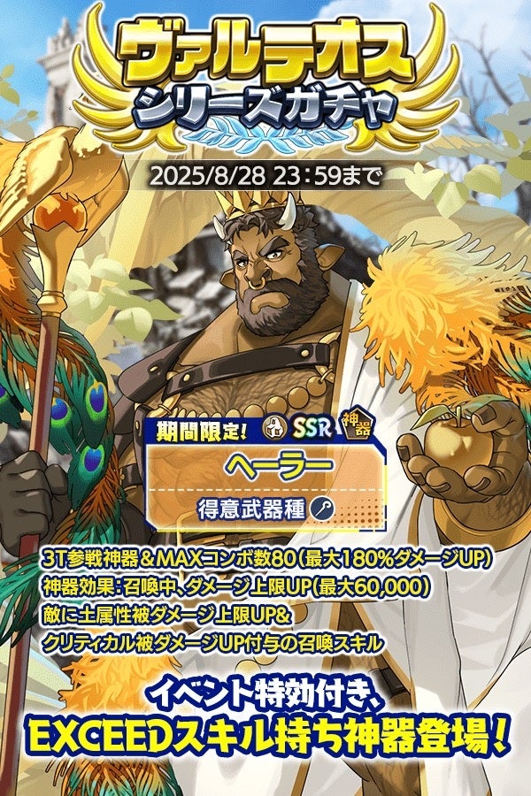 イベント特攻付き、EXCEEDスキル持ちの新シリーズ神器が登場する「ヴァルテオスシリーズガチャ」が開催!今回は「ヘーラー」が登場します!