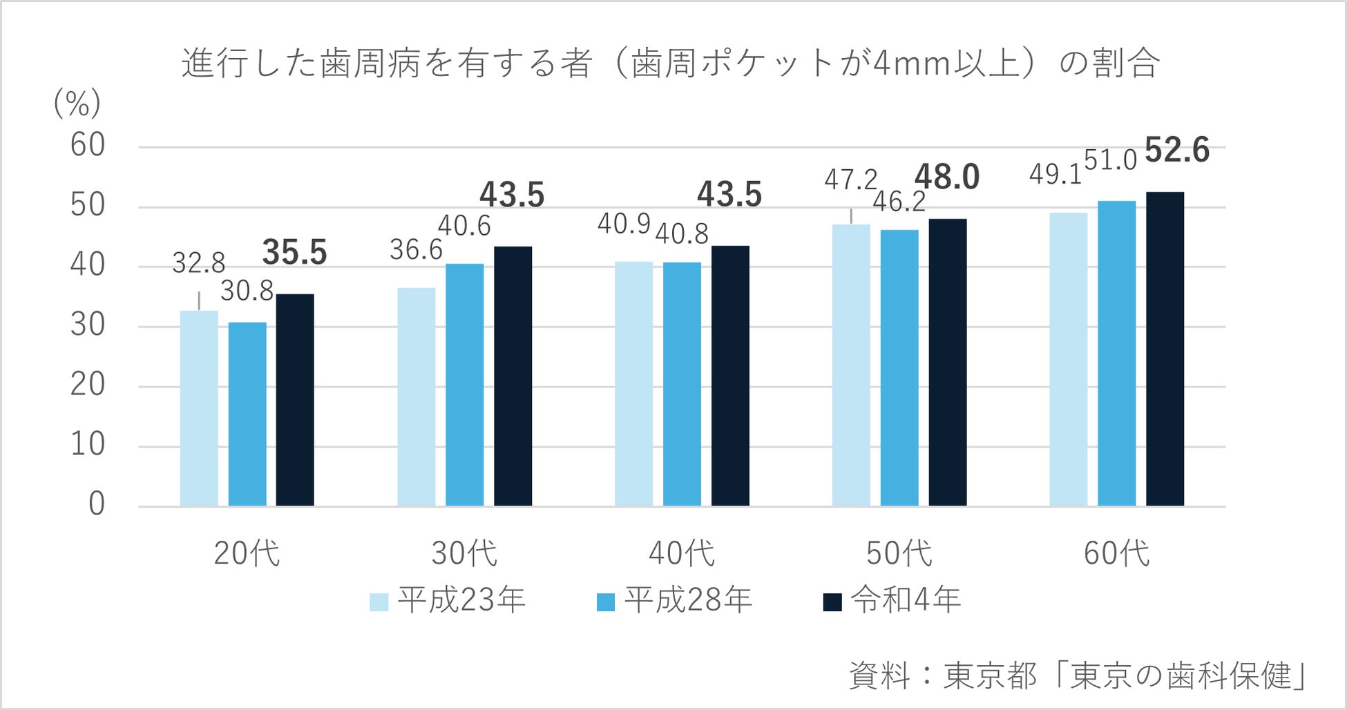 東京都の調査では、進行した歯周病(歯周ポケット4mm以上)がある人の割合は、20代・30代とも増加傾向にあり、令和4年には20代で35.5%、30代で43.5%となっています。