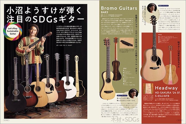 第2特集は、近年何かと話題のSDGsとギター作りの関係について。SDGsとは持続可能な開発目標のことを指しますが、おもに木材で製作されるギター業界でも、この取り組みに賛同するブランドがさまざまなアクションを起こしています。マーティン社のハイプレッシャー・ラミネイト(端材を使った集積材)、テイラー社のアーバンウッド(倒木材や区画整理で伐採された材)などがその代表例で、地産地消を目指して国産材の可能性に挑戦する国内メーカー、さまざまな企業とコラボレートする島村楽器主宰のEvergreen Project(売上の一部を植樹費用として寄付)などが存在しています。そんなSDGsなギターをテーマに各ブランドの理念や試みを紹介するとともに、ギターとしてのポテンシャルを追求するべく、ジャズ・ギタリストの小沼ようすけによる試奏を通し、その実力を検証していきます。