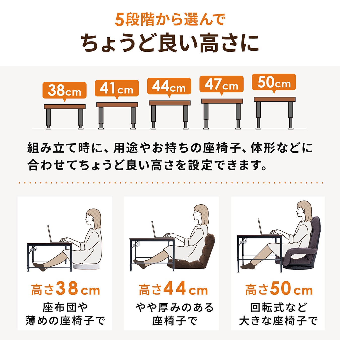 38cm〜50cmまで5段階の高さ調整が可能なため、床座での作業、座椅子を使った勉強、ソファ前でのくつろぎワーク…どんなスタイルにもフィットします。家族それぞれの身長や使い方に合わせられるため、リビング学習や在宅ワークなど幅広いシーンで活躍します。