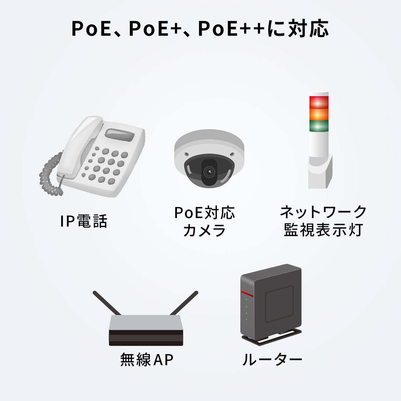 PoE給電ネットワークのPoE、PoE+、PoE++に対応します。