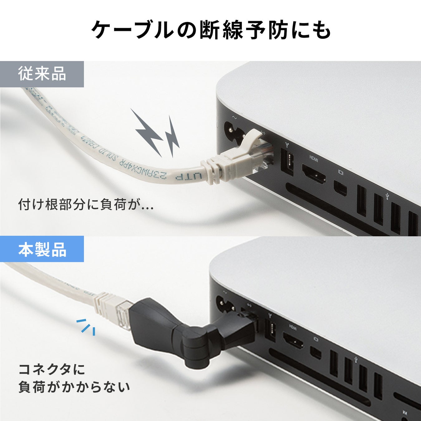 コネクタの付け根に負荷がかからないので、ケーブルの断線予防になります。