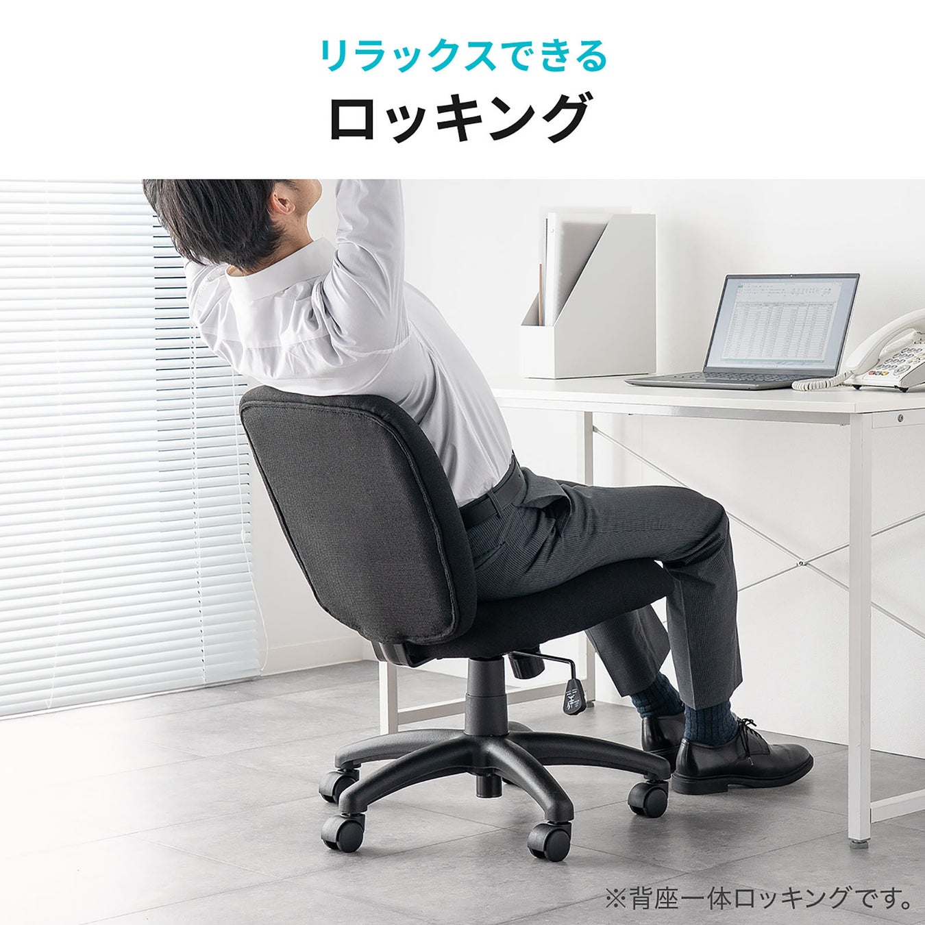 立体肉厚クッションと体に沿う背もたれで姿勢を支え、ロッキングでくつろげる布張りワークチェア