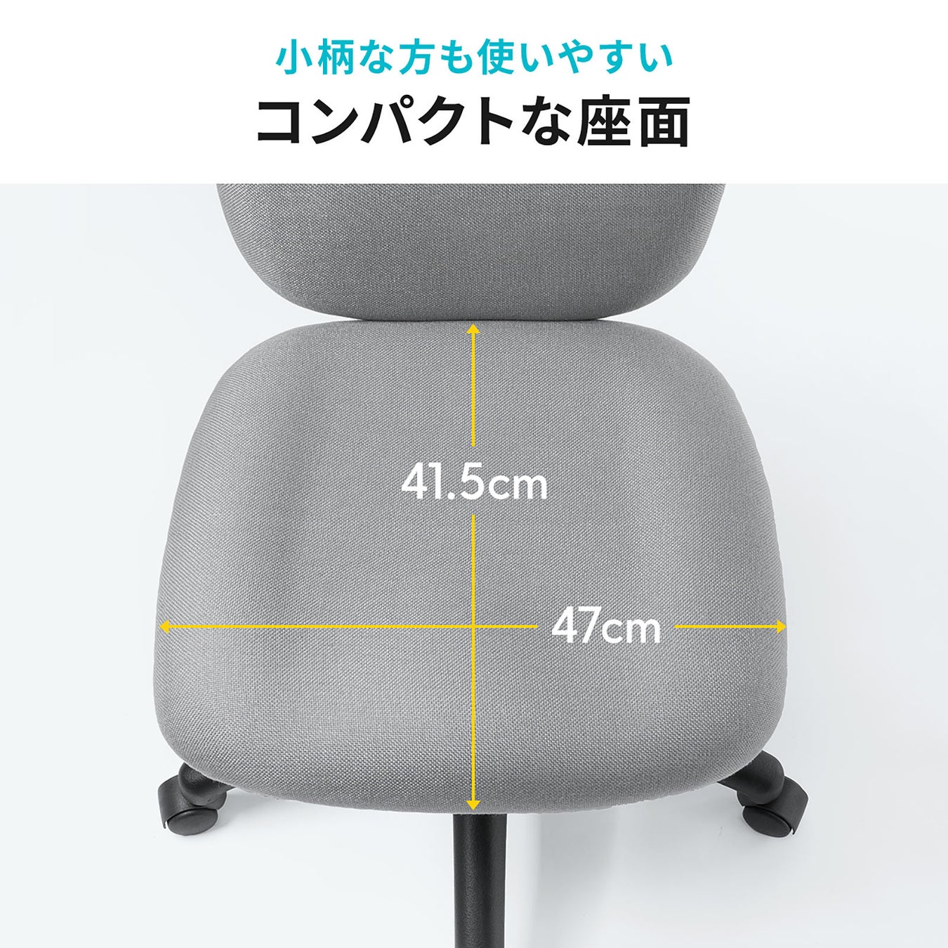 座面奥行は41.5cmのコンパクトサイズ。限られたデスク周りやワンルームの作業スペースでも圧迫感が少なく、動きやすさも確保できます。幅約47cmで安定感もあるため、体格を問わず使いやすい絶妙バランス。デスク下への収まりも良く、部屋をすっきり見せたい方にもおすすめです。