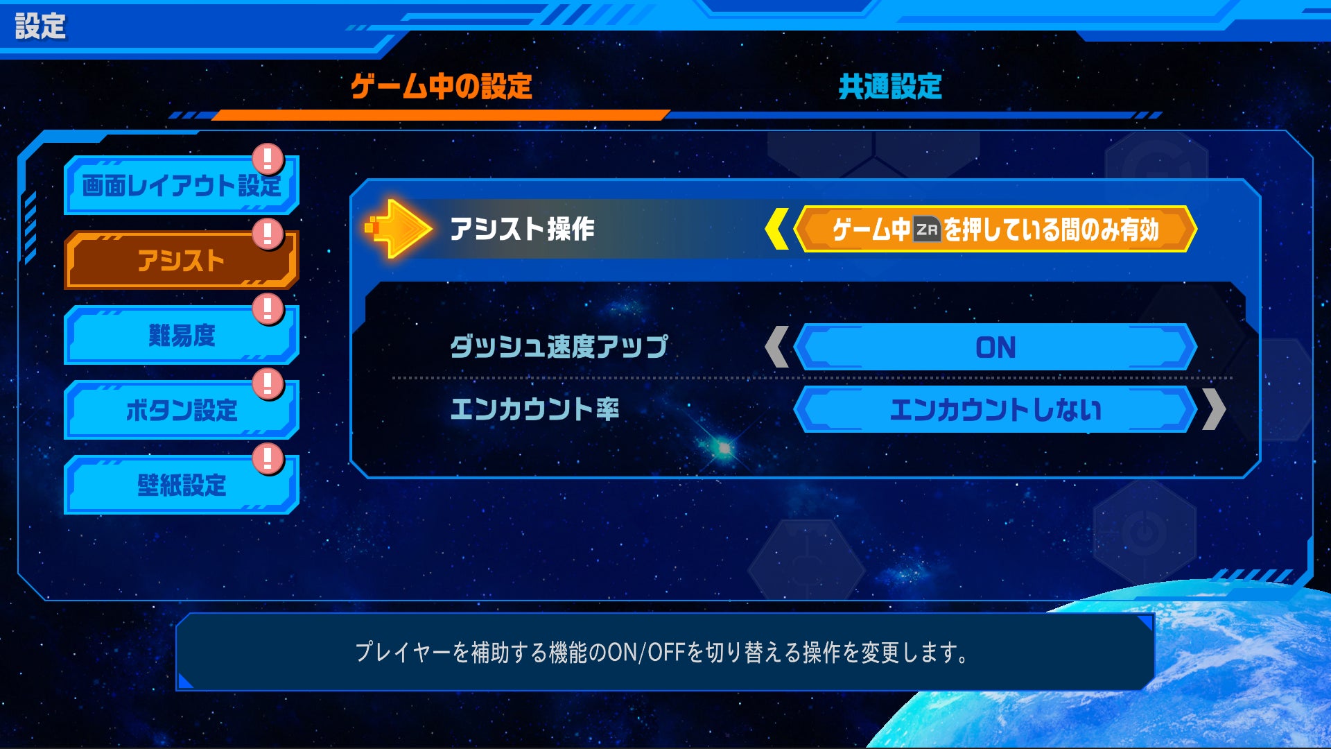 ロックバスターの攻撃力増加や被ダメージ軽減といったバトル中の設定から、移動速度アップや敵とのエンカウント率などのフィールド設定まで、さまざまな項目をオプションで調整可能です。