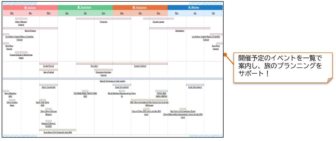 桜やお祭り等の季節ごとの見どころ、東京で開催される国際的なイベント等の年間スケジュールをチェックできるイベントカレンダーを新たに搭載