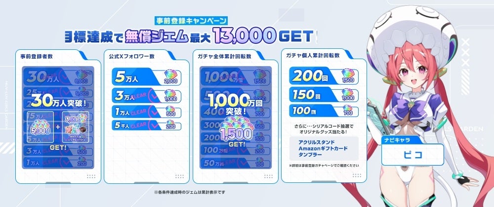 現在実施中の事前登録キャンペーンでは、事前登録者数が30万人突破・公式Xフォロワー3万人・ガチャ累計回転数1,000万回達成したことで「無償ジェム10,500個」+「豪華アイテム」の配布が決定いたしました!