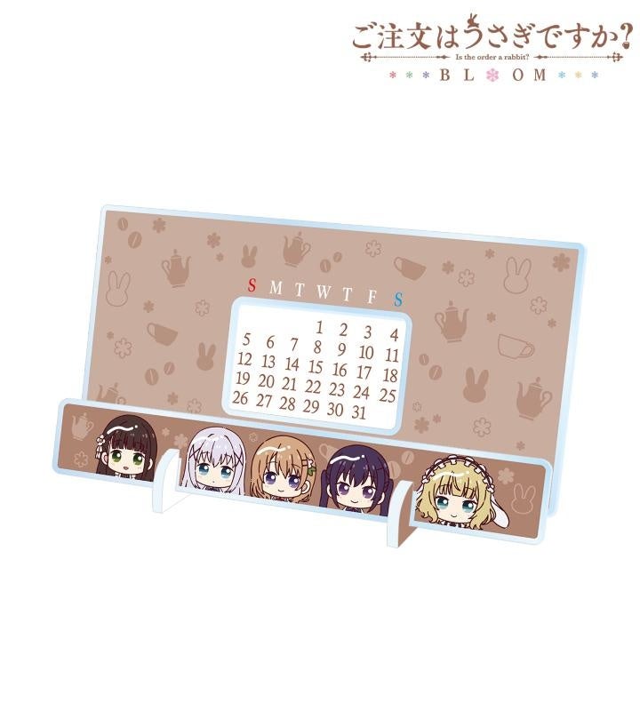 ココア、チノ、リゼ、千夜、シャロがちょこんと立っているちびキャラを新たに描き起こし、卓上アクリル万年カレンダーに仕上げました。