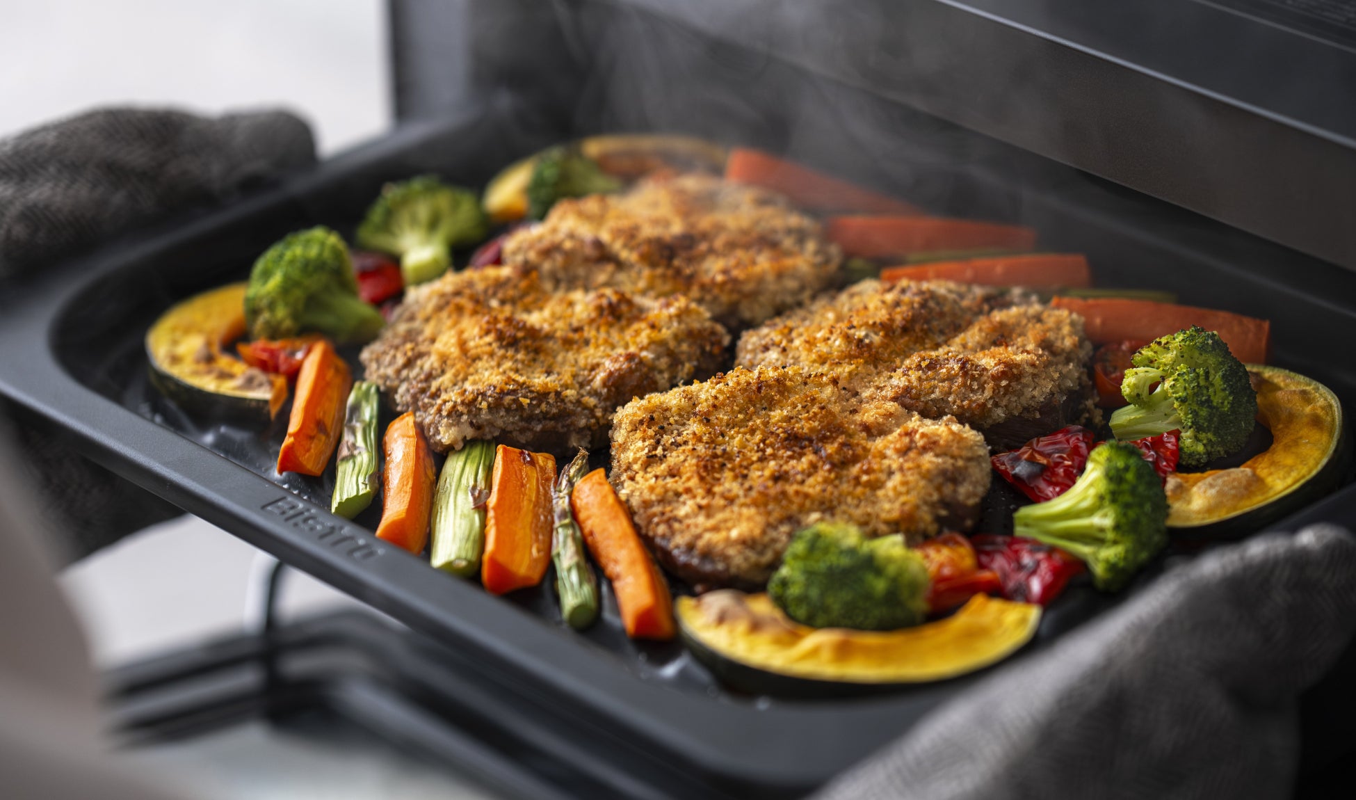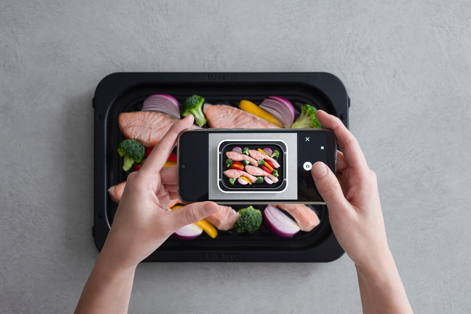 ヒートグリル皿にのせた食材を、キッチンポケットアプリ(※2)で撮影すると食材の量を1%単位ではかり(※3)、最適な加熱プログラムを提案。両面グリルとスチーム加熱の組み合わせにより冷凍食材や生鮮食材、焦げ付きやすいたれ漬けの食材も同時に調理することが可能。