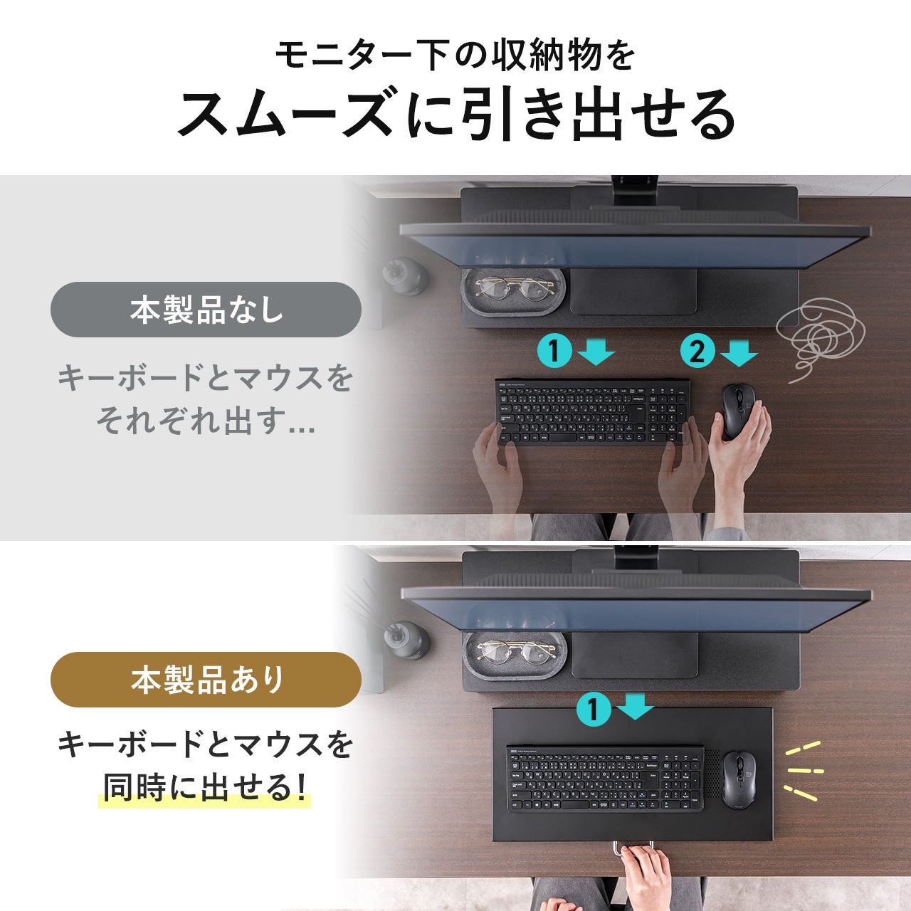 モニター台下のスペースを有効活用し、キーボードやノートPCをすっきり収納できる卓上スライダー。小型ローラーでスムーズに引き出せ、使わない時はすっきり収まります。省スペース化と作業効率向上を同時に実現する便利なアイテムです。