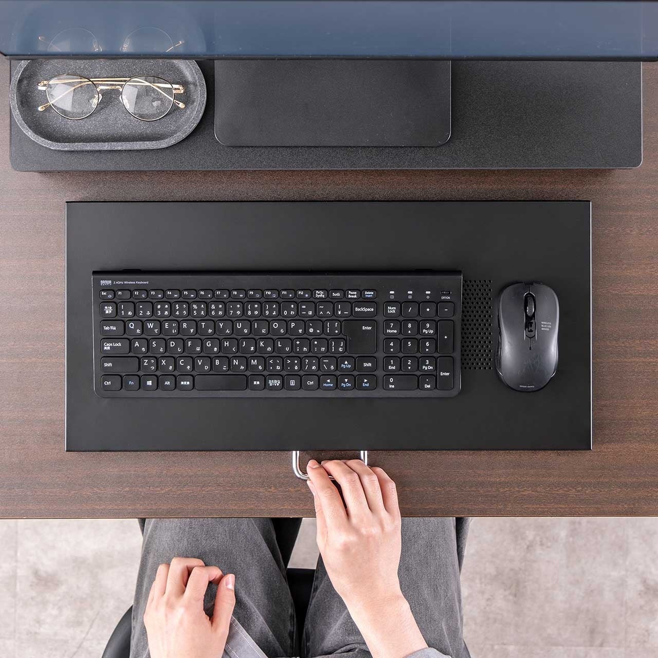 底面の小型ローラーが軽快なスライド動作を実現。片手で簡単に引き出せる前面取っ手とあわせて、日々の操作がより快適になります。デスク環境を整えたい方に最適な、使いやすさを追求したキーボードスライダーです。