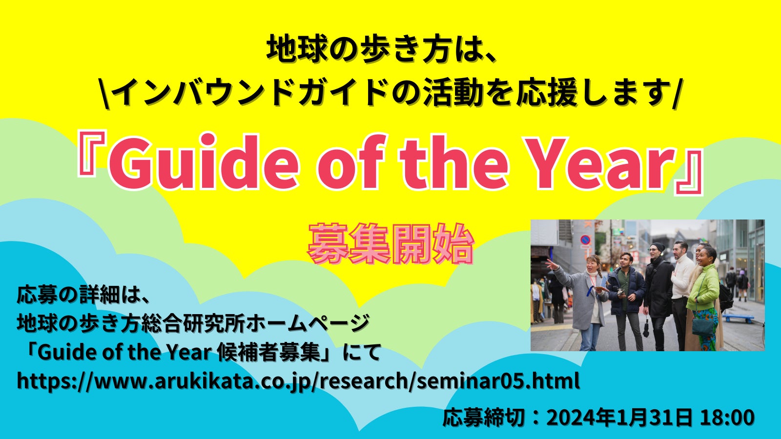 株式会社 学研ホールディングス(東京・品川/代表取締役社長:宮原博昭)のグループ会社、株式会社 地球の歩き方(東京・品川/代表取締役社長:新井邦弘)が運営する地球の歩き方総合研究所は、訪日外国人旅行(インバウンド)再開の動きが本格化し、各地で高付加価値旅行(※1)の機運が高まる中、旅行者ニーズの高度化と多様化に対応するガイドの方々にスポットライトを当て、その活動を応援する表彰『Guide of the Year』の募集を2024年1月31日(水)まで実施中です。