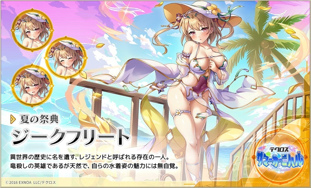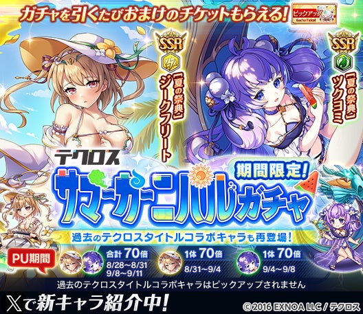 合同会社EXNOA(本社:東京都港区、CEO:村中 悠介、URL:https://games.dmm.com/ )が運営するDMM GAMESにおいて『神姫PROJECT』は、テクロスサマーカーニバルの開催を発表した。あやかしランブル!とれじぇくろ!から「ツクヨミ」「ジークフリート」が参戦し、最大140連無料で引ける「テクロスサマーカーニバル記念!10連ガチャ」も開催!
