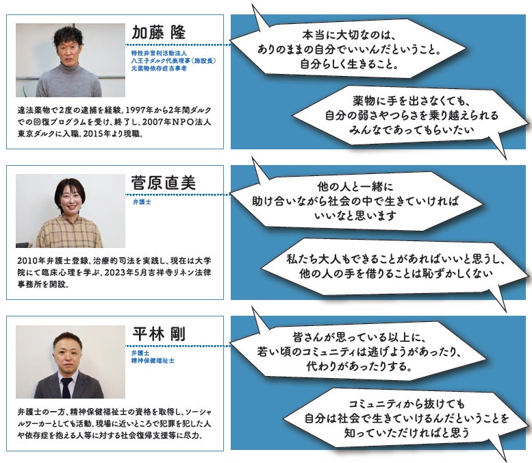 ・元薬物依存症当事者の方や、薬物問題を抱える人への支援を行う専門家によるリアルな声を届け、相談することの重要性を伝え、従来の薬物乱用の危険性の訴求だけでは解決できない状況に対し、寄り添う形の啓発。