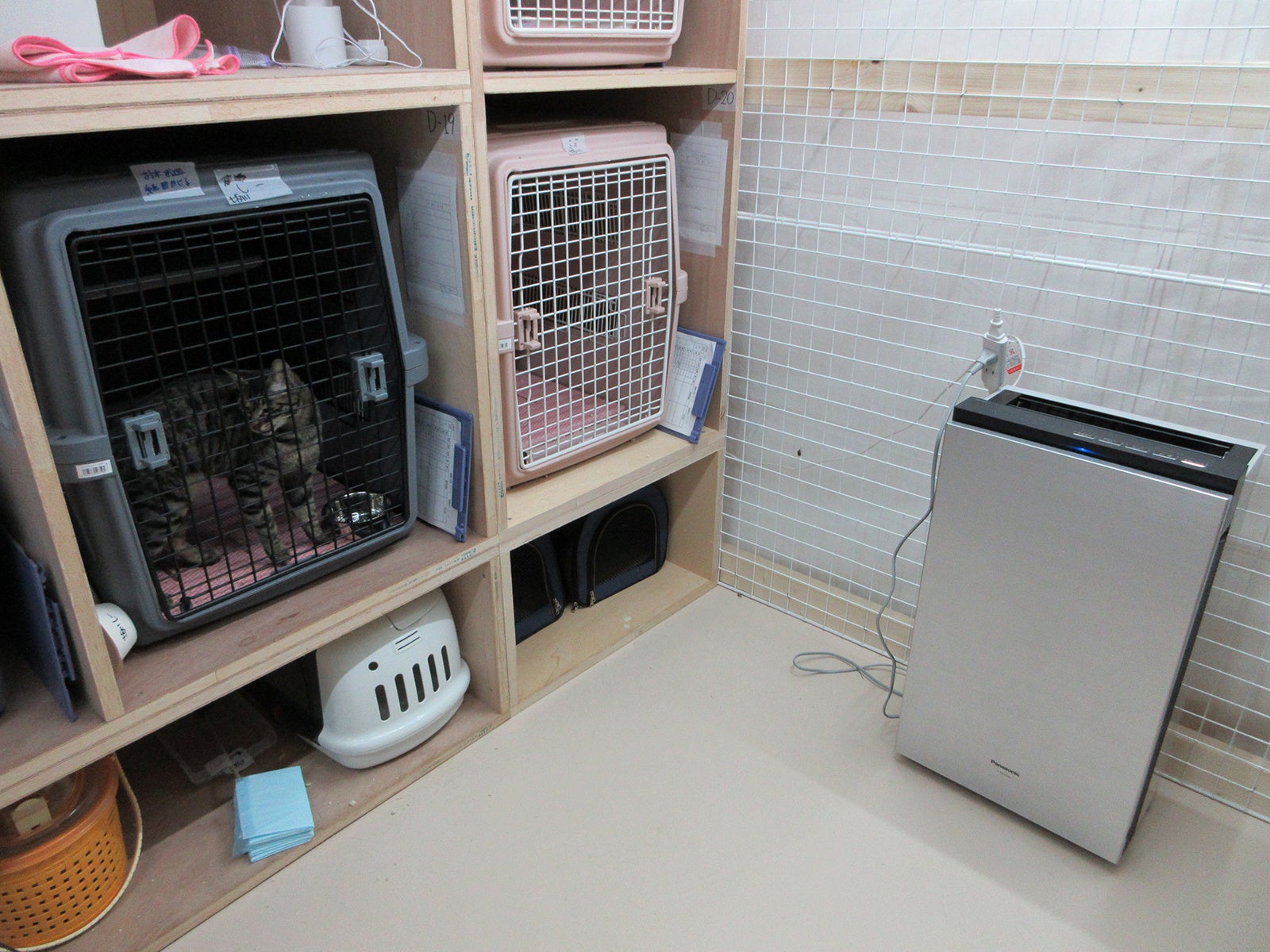 被災者の大切なペットを守るシェルターは、トレーラーハウスや改良した倉庫の中に設置され、1頭ずつゲージに入れて保護しています。ただし、複数のペットが同じ空間にいるため、体臭、排泄物などのニオイが課題でした。「令和6年能登半島地震動物対策本部」保護対策班・班長の北秀春獣医師は、自身が院長を務める「あすなろ動物病院」(石川県金沢市)で現在、次亜塩素酸 空間除菌脱臭機「ジアイーノ」を4台使用しており、確かな脱臭力を実感していることから、パナソニック 空質空調社に協力を要請。2024年1月に3台、3月に4台、合計7台の寄贈が実現しました。