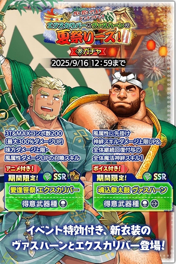 さらに、SSR魂友「魂込祭太鼓 ヴァスハーン」とSSR神器「愛逢笹祭 エクスカリバー」が入手可能な期間限定の「想い願い打上! ドンドコドン!エクスカリバーとヴァスハーンの夏祭りーズ!」ガチャも登場!