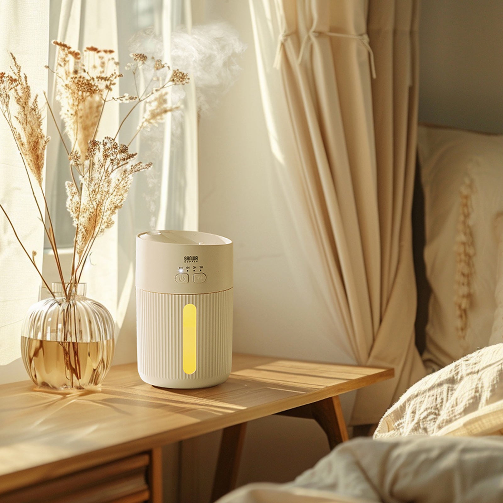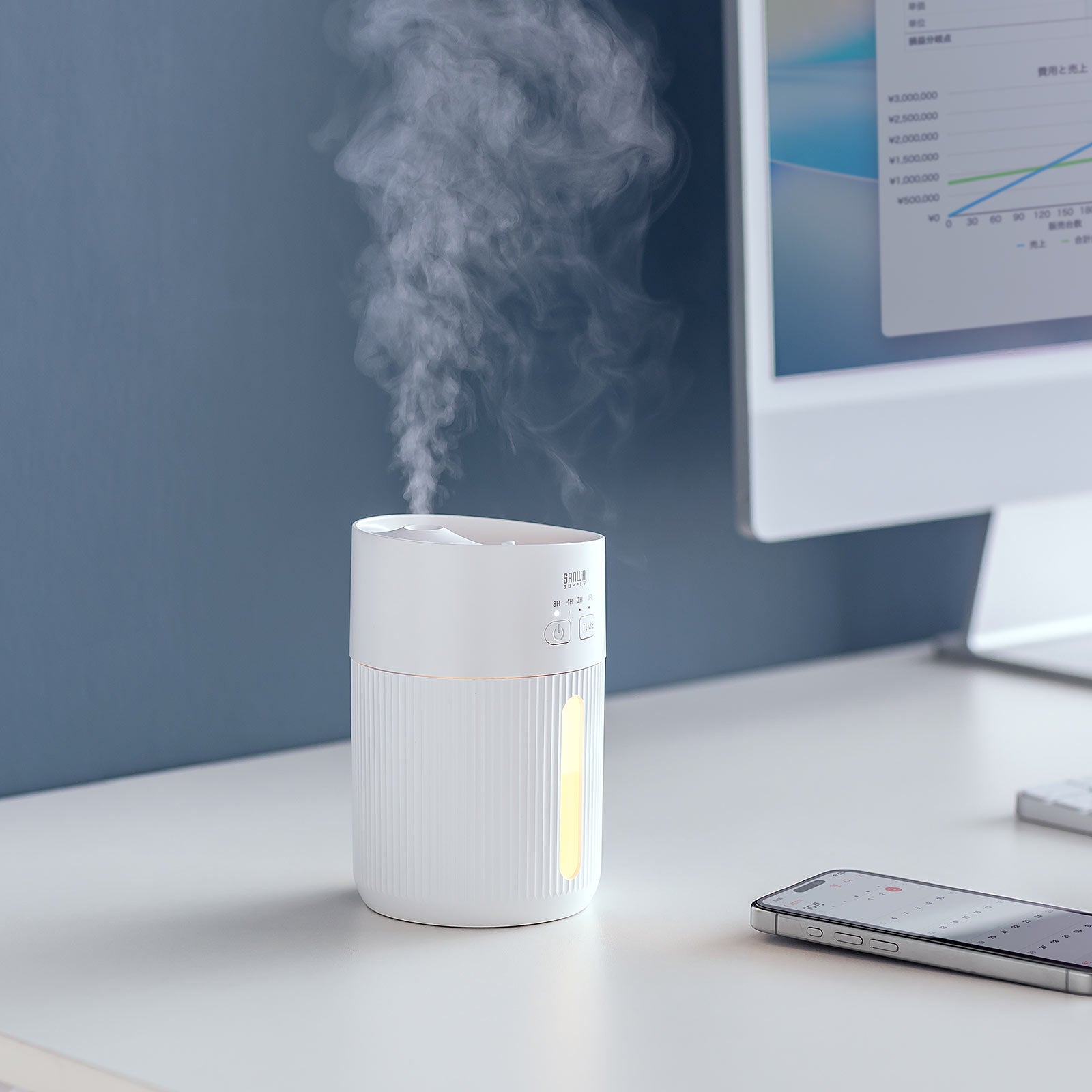約400mlの大容量タンクを搭載し、最大20時間の長時間加湿が可能。連続運転モードとリズム運転モードを切り替えられるため、シーンに合わせて快適な湿度を保てます。乾燥が気になる季節も、一晩中しっとりと潤います。