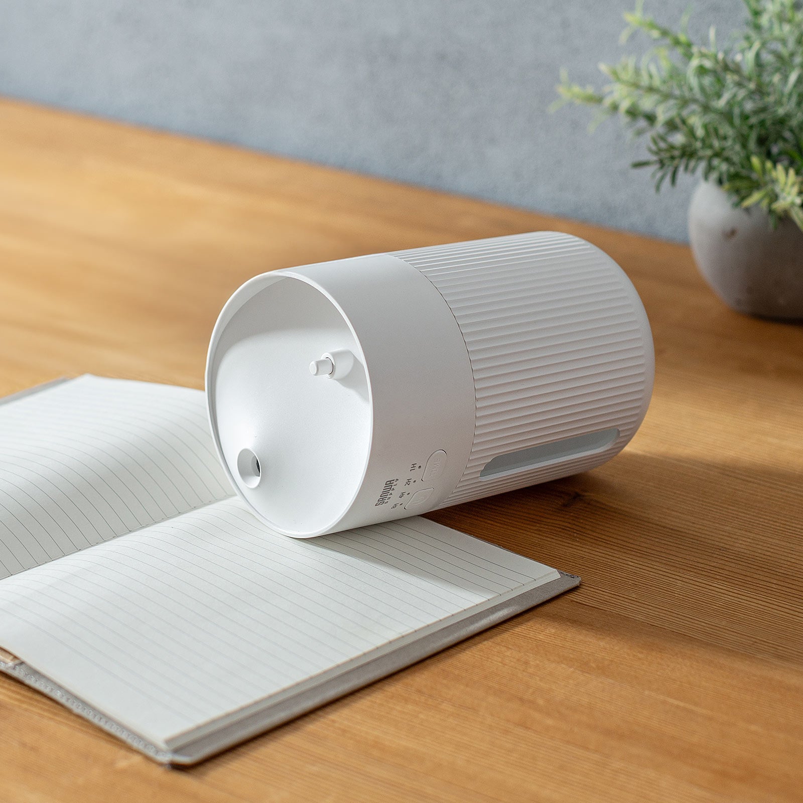 フタを開けずに上から注ぐだけで簡単に給水でき、どこでも使えるバッテリー内蔵の卓上加湿器