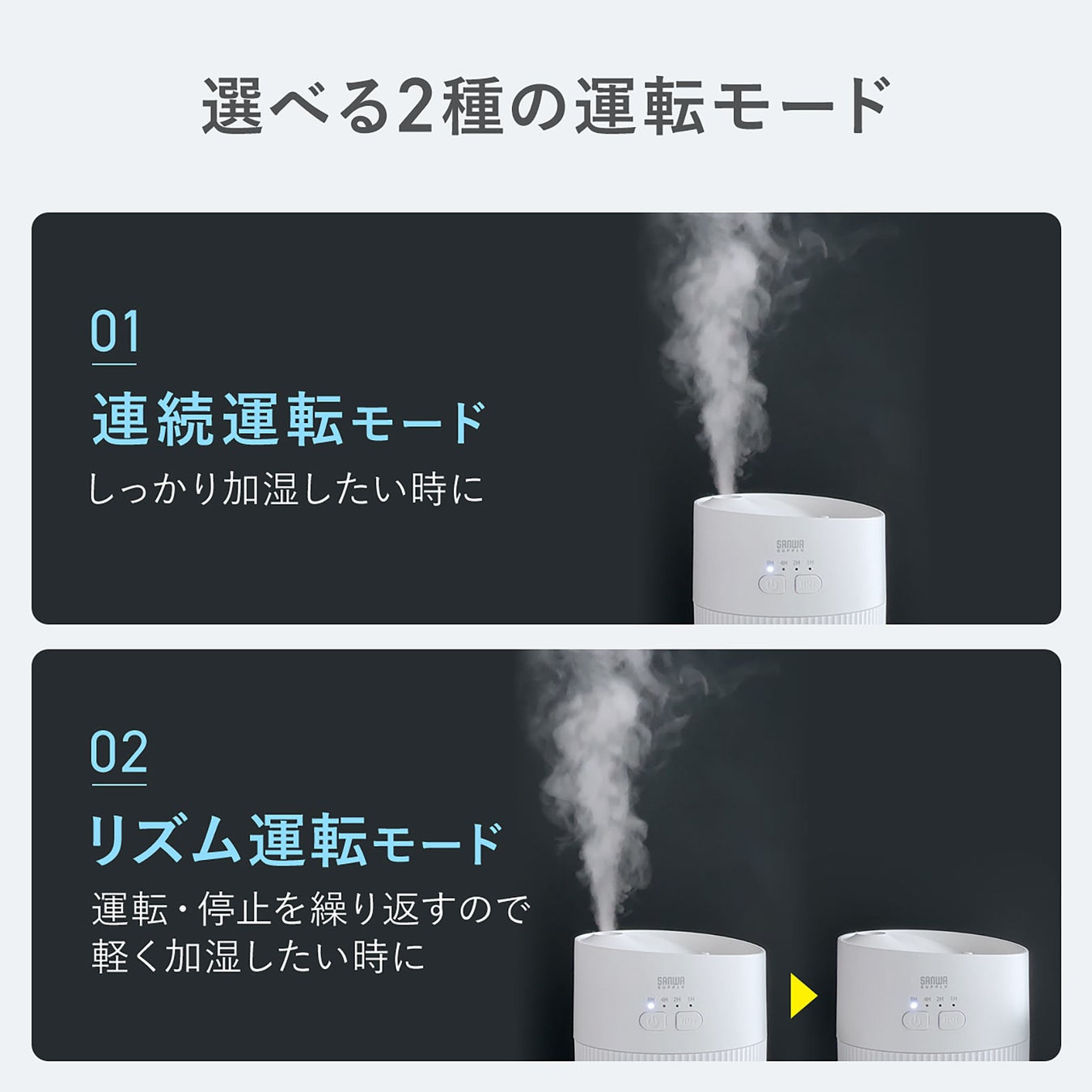 超音波式だからミストは熱くならず、お子様やペットがいる家庭でも安心。動作音も静かで、就寝中や集中したい作業時にも気になりません。やさしいLEDライトを点灯させれば、ナイトライトとしても活躍します。