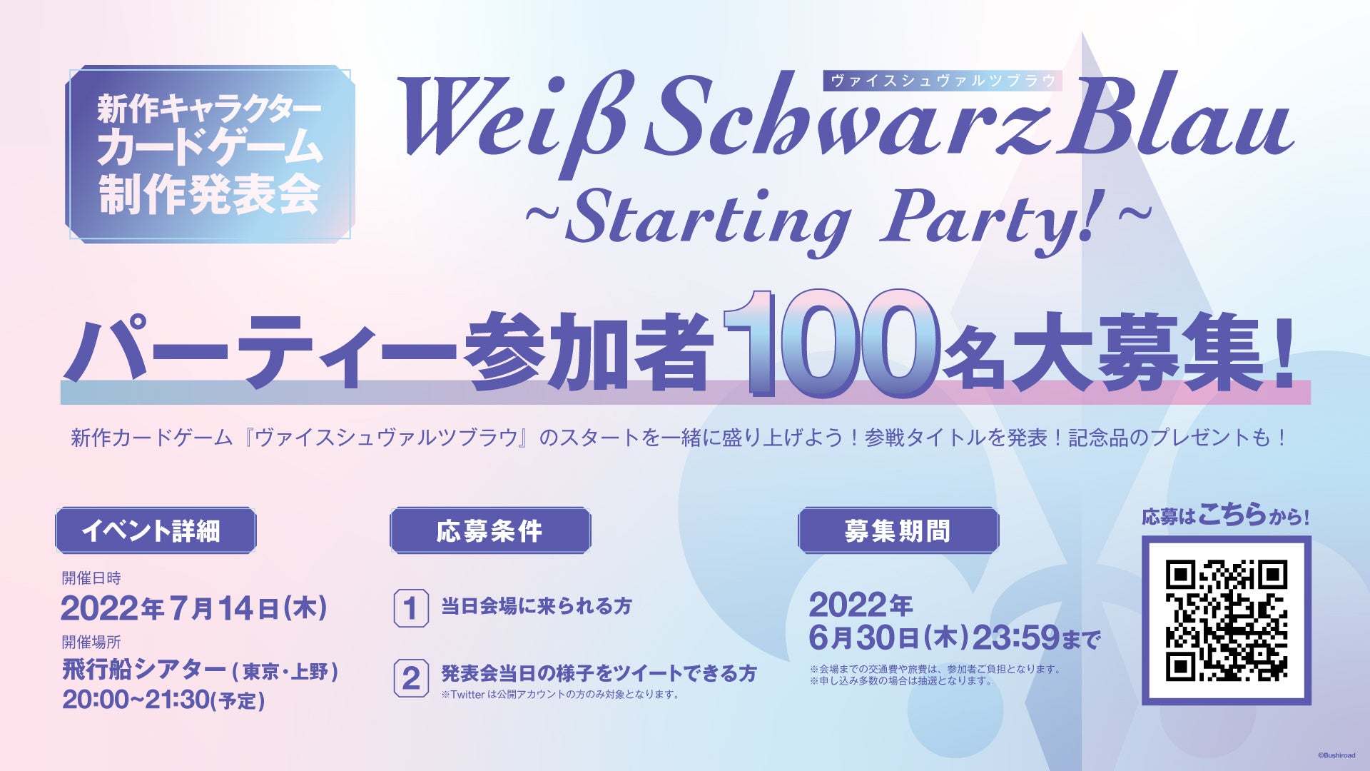 株式会社ブシロード(本社:東京都中野区 代表取締役社長:橋本義賢、以下、ブシロード)は、7月14日(木)に新作キャラクターカードゲーム制作発表会「ヴァイスシュヴァルツブラウ~Starting Party!~」を開催することをお知らせいたします。報道関係の皆様におかれましては、ぜひ本情報をお取り扱いいただけますようお願い申し上げます。
